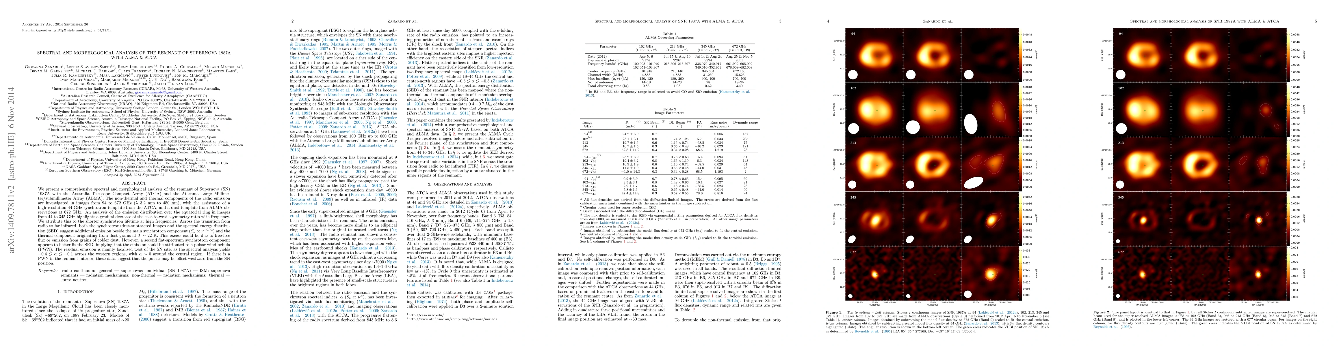 This study uses ALMA and ATCA to analyze the spectral and morphological features of Supernova 1987A's remnant, revealing a decrease in east-to-west asymmetry with frequency due to shorter synchrotron lifetimes. The data suggest an additional emission component, possibly from a pulsar wind nebula, with a residual emission localized west of the supernova site.