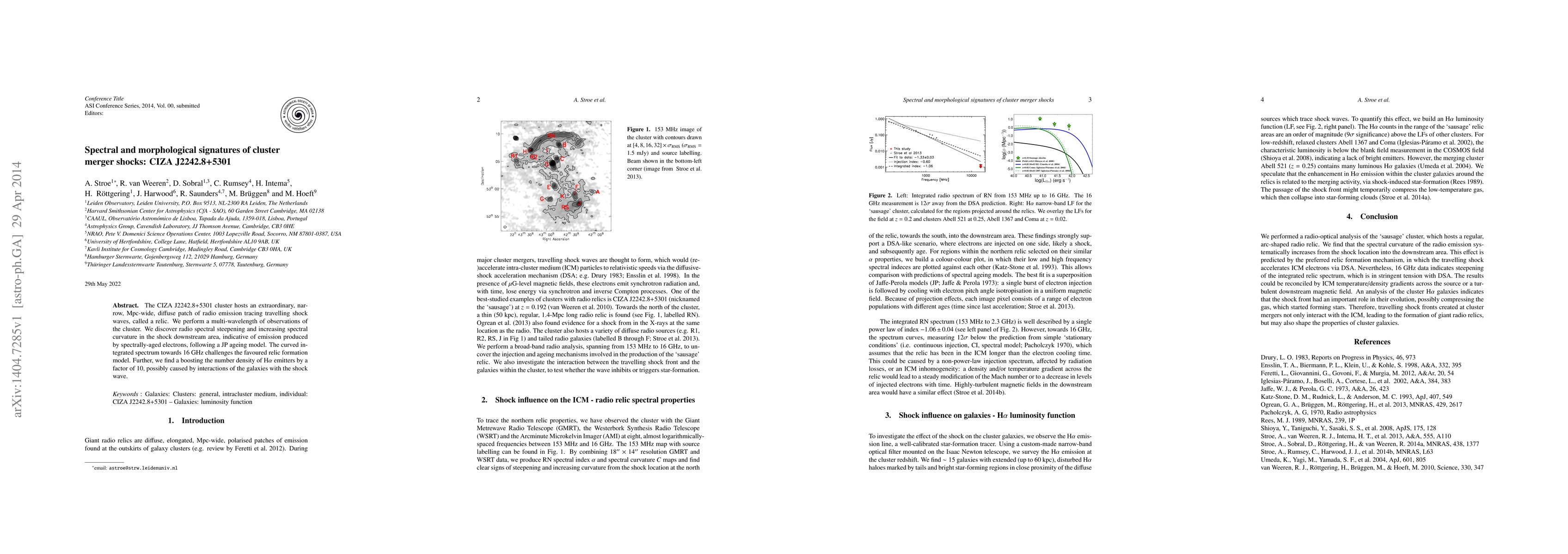 The CIZA J2242.8+5301 cluster hosts an extraordinary, narrow, Mpc-wide, diffuse patch of radio emission tracing travelling shock waves, called a relic. We perform a multi-wavelength of observations of the cluster. We discover radio spectral steepening and increasing spectral curvature in the shock downstream area, indicative of emission produced by spectrally-aged electrons, following a JP ageing model. The curved integrated spectrum towards $16$ GHz challenges the favoured relic formation model. Further, we find a boosting the number density of H$\alpha$ emitters by a factor of $10$, possibly caused by interactions of the galaxies with the shock wave.