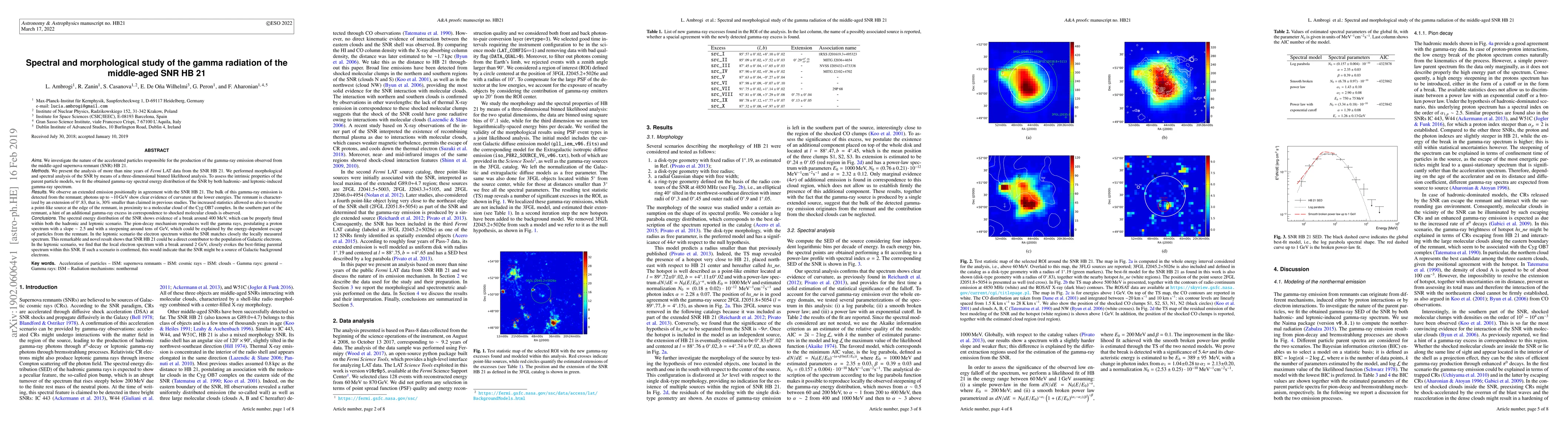 This paper analyzes nine years of Fermi LAT data to study gamma-ray emission from the supernova remnant HB 21, revealing an extended emission and a point-like source near a molecular cloud. The spectral energy distribution indicates a break around 400 MeV, fitting both hadronic and leptonic models, suggesting HB 21 could contribute to Galactic background electrons.