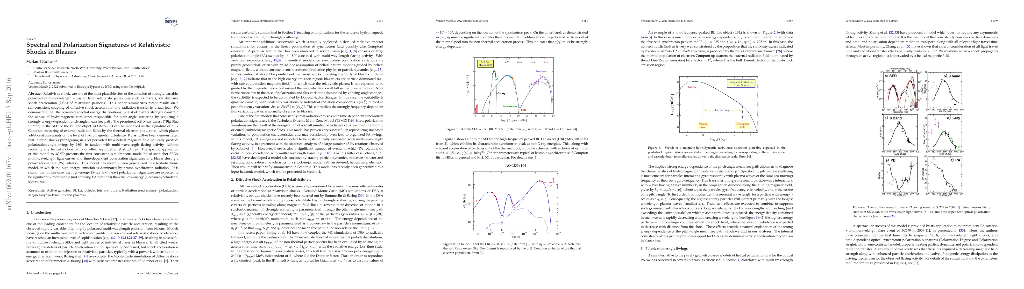 This paper investigates the spectral and polarization signatures of relativistic shocks in blazar jets, demonstrating that observed SEDs constrain the nature of hydromagnetic turbulence. It shows that internal shocks in helical magnetic fields can produce polarization-angle swings and multi-wavelength flares without requiring asymmetric jet structures.