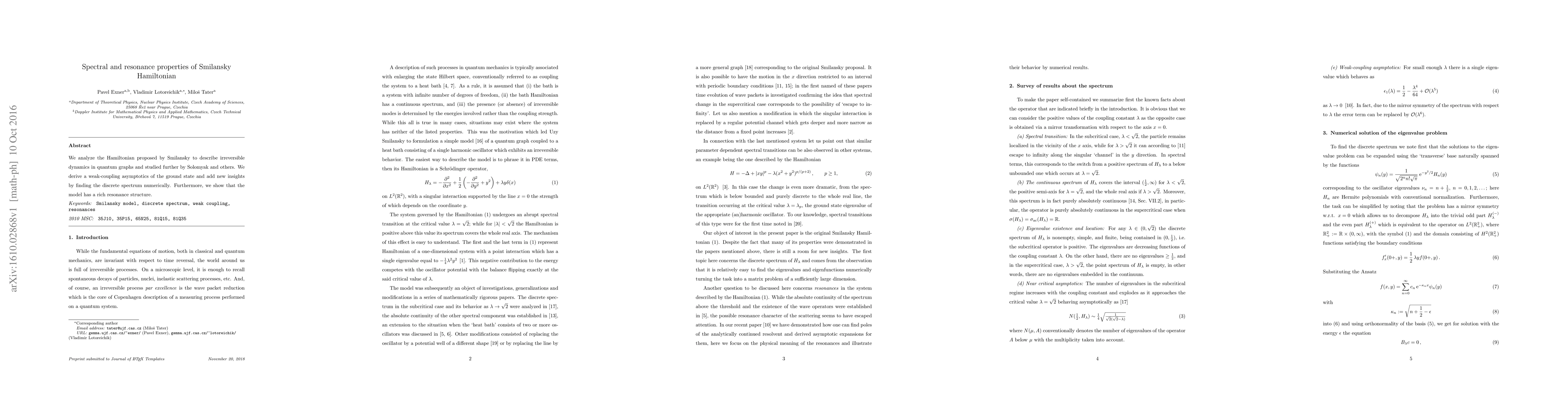 We analyze the Hamiltonian proposed by Smilansky to describe irreversible dynamics in quantum graphs and studied further by Solomyak and others. We derive a weak-coupling asymptotics of the ground state and add new insights by finding the discrete spectrum numerically. Furthermore, we show that the model has a rich resonance structure.
