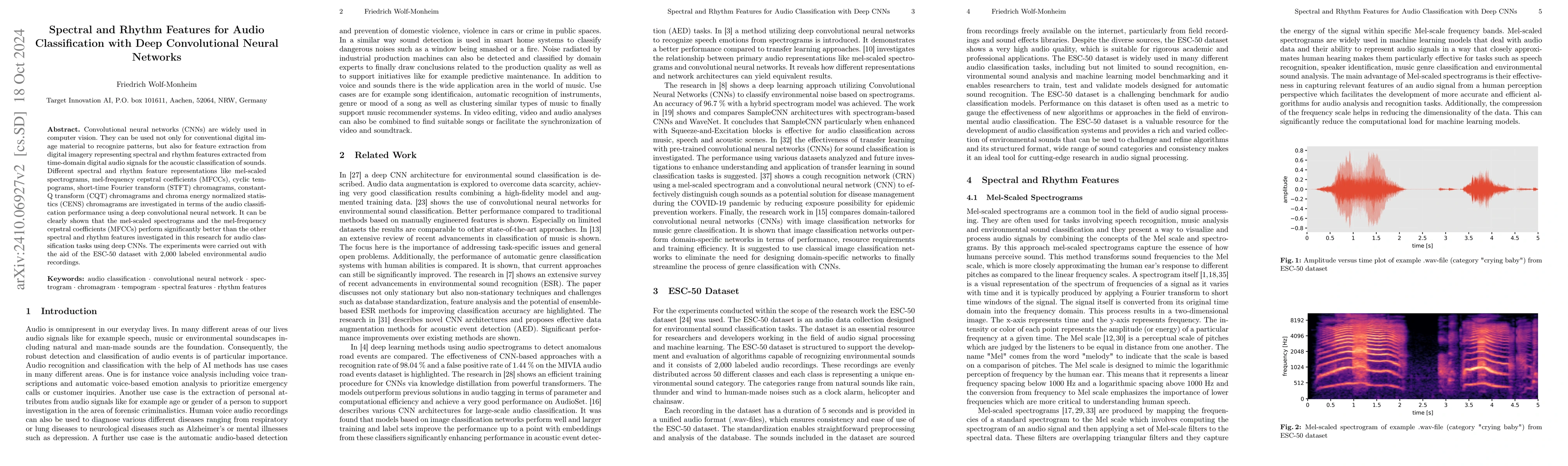 This research investigates various spectral and rhythm feature representations for audio classification using deep convolutional neural networks (CNNs), demonstrating that mel-scaled spectrograms and mel-frequency cepstral coefficients (MFCCs) outperform others, based on experiments on the ESC-50 dataset.