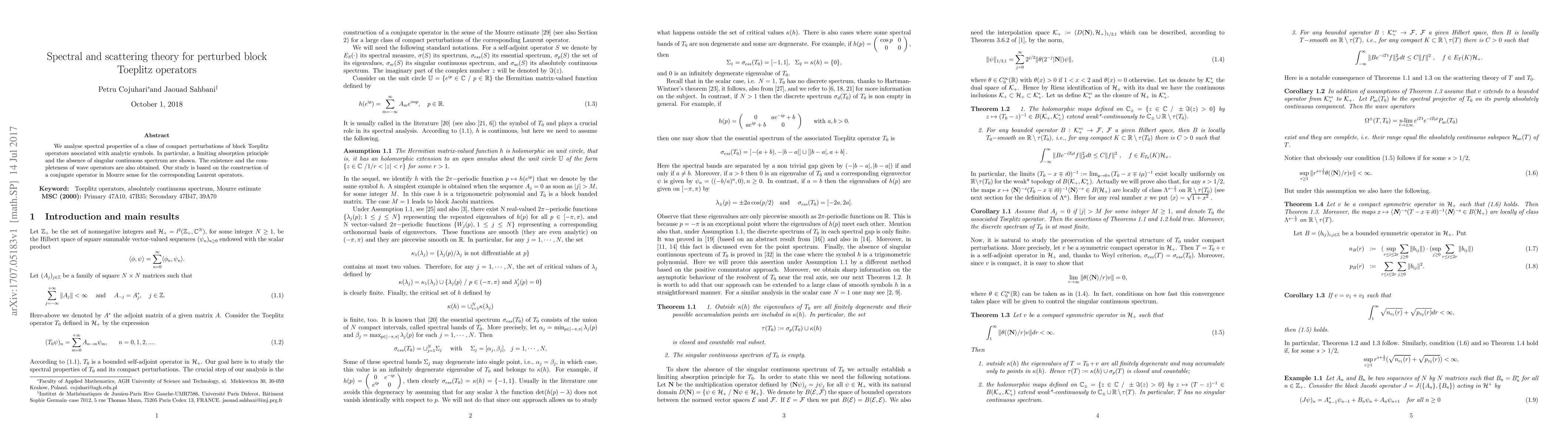We analyse spectral properties of a class of compact perturbations of block Toeplitz operators associated with analytic symbols. In particular, a limiting absorption principle and the absence of singular continuous spectrum are shown. The existence and the completeness of wave operators are also obtained. Our study is based on the construction of a conjugate operator in Mourre sense for the corresponding Laurent operators.