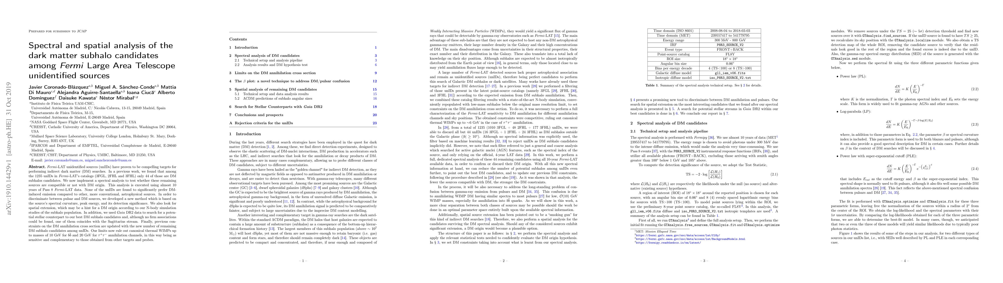 Fermi-LAT unidentified sources (unIDs) have proven to be compelling targets for performing indirect dark matter (DM) searches. In a previous work, we found that among the 1235 unIDs in Fermi-LAT catalogs (3FGL, 2FHL and 3FHL) only 44 of those are DM subhalos candidates. We now implement a spectral analysis to test whether these remaining sources are compatible or not with DM origin. This analysis is executed using almost 10 years of Pass 8 Fermi-LAT data. None of the unIDs are found to significantly prefer DM-induced emission compared to other, more conventional, astrophysical sources. In order to discriminate between pulsar and DM sources, we developed a new method which is based on the source's spectral curvature, peak energy, and its detection significance. We also look for spatial extension, which may be a hint for a DM origin according to our N-body simulation studies of the subhalo population. In addition, we used Gaia DR2 data to search for a potential stellar counterpart to our best DM subhalo candidates and, although no firm associations could be found, one of them coincides with the Sagittarius stream. Finally, previous constraints on the DM annihilation cross section are updated with the new number of remaining DM subhalo candidates among unIDs. Our limits now rule out canonical thermal WIMPs up to masses of 10 GeV for $b\bar{b}$ and 20 GeV for $\tau^+\tau^-$ annihilation channels, in this way being as sensitive and complementary to those obtained from other targets and probes.