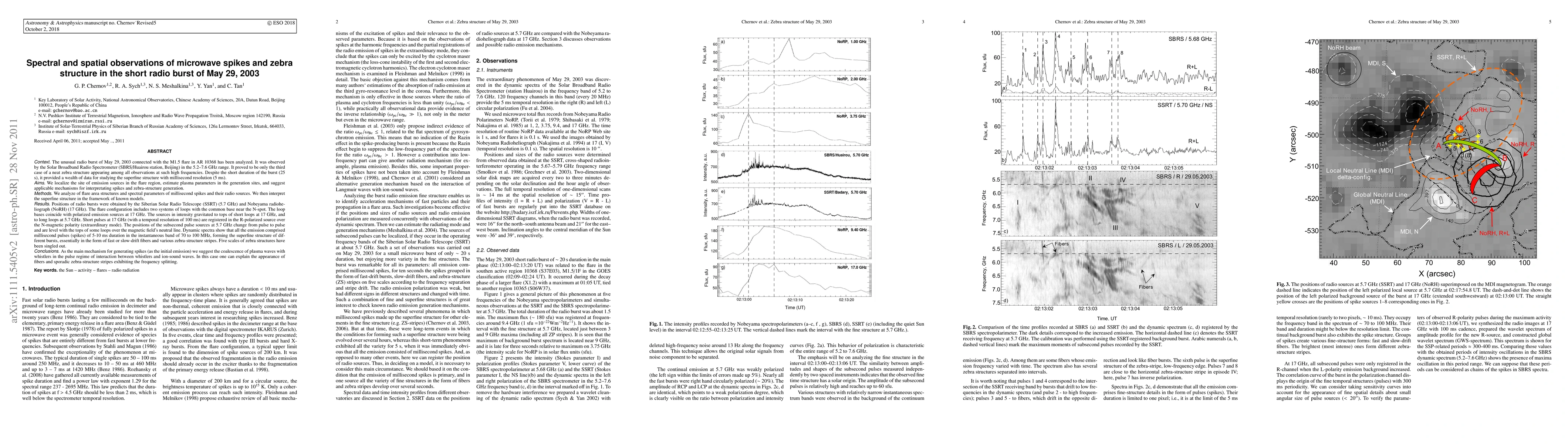 This paper analyzes a unique radio burst from May 29, 2003, linked to an M1.5 flare, observed with high-frequency resolution. It identifies zebra structures and spikes, suggesting mechanisms for their generation, and localizes emission sources in the flare region.