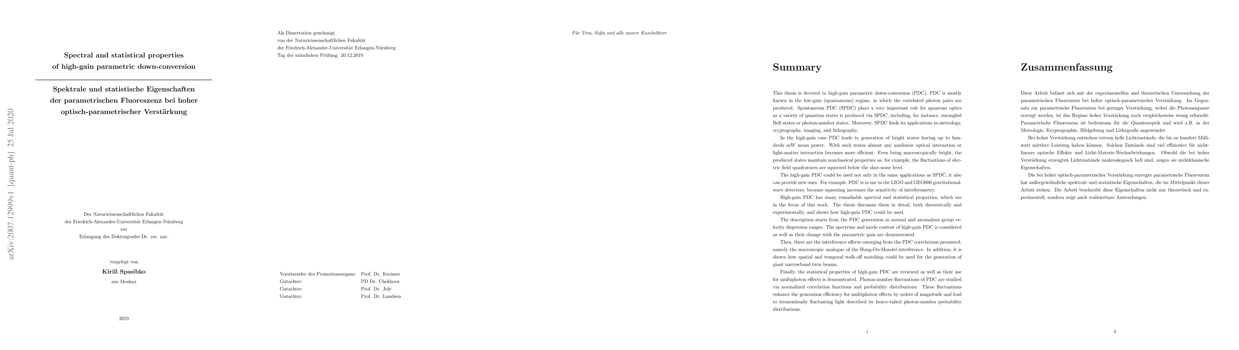 This paper investigates the spectral and statistical properties of high-gain parametric down-conversion, highlighting its nonclassical features and potential applications. It explores the generation of bright states with squeezed fluctuations and examines the unique spectral and statistical characteristics, including interference effects and the generation of narrowband twin beams.