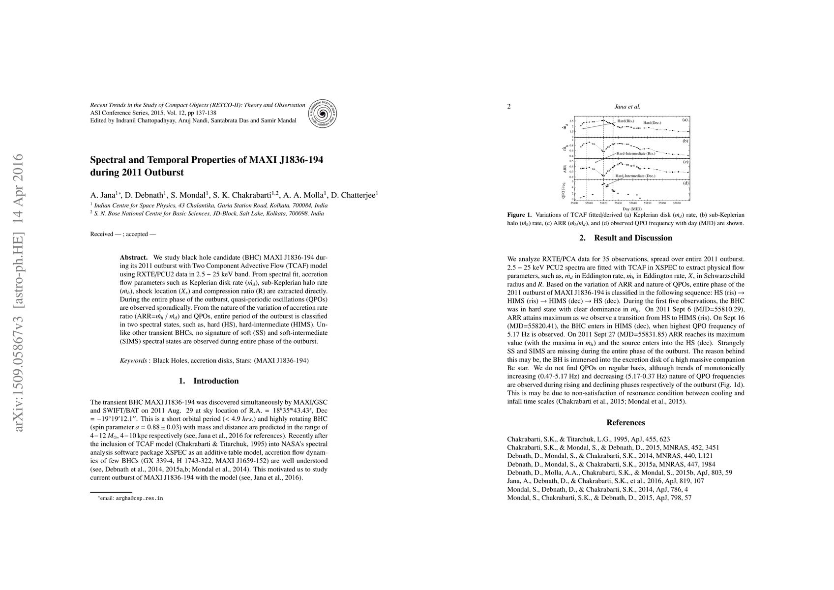 We study black hole candidate (BHC) MAXI~J1836-194 during its 2011 outburst with Two Component Advective Flow (TCAF) model using RXTE/PCU2 data in $2.5-25$~keV band. From spectral fit, accretion flow parameters such as Keplerian disk rate ($\dot{m_d}$), sub-Keplerian halo rate ($\dot{m_h}$), shock location ($X_{s}$) and compression ratio (R) are extracted directly. During the entire phase of the outburst, quasi-periodic oscillations (QPOs) are observed sporadically. From the nature of the variation of accretion rate ratio (ARR=$\dot{m_h}$ / $\dot{m_d}$) and QPOs, entire period of the outburst is classified in two spectral states, such as, hard (HS), hard-intermediate (HIMS). Unlike other transient BHCs, no signature of soft (SS) and soft-intermediate (SIMS) spectral states are observed during entire phase of the outburst
