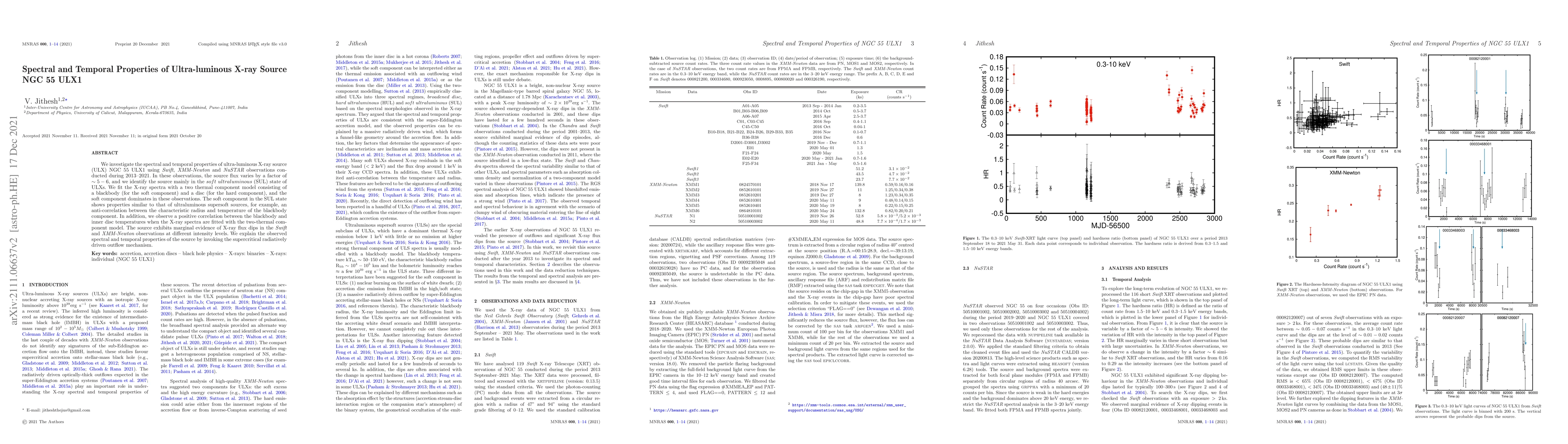 This study analyzes the spectral and temporal properties of ultra-luminous X-ray source NGC 55 ULX1 using observations from 2013-2021, revealing a flux variation by a factor of 5-6 and a dominant soft ultraluminous state. The source's spectra are best fit with a two-thermal component model, showing properties akin to ultraluminous supersoft sources and marginal evidence of flux dips.