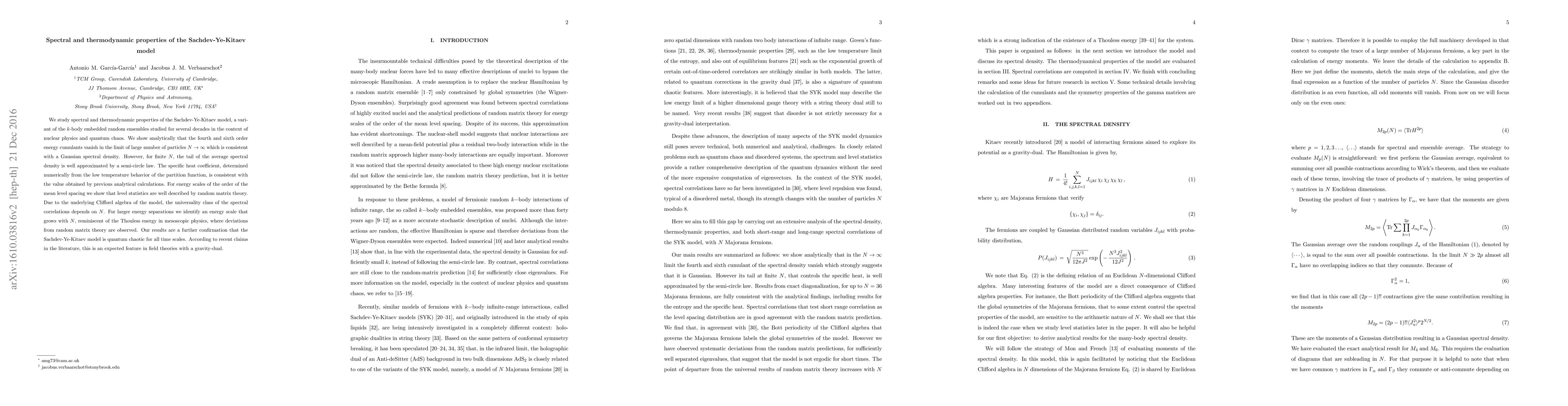 This paper investigates the spectral and thermodynamic properties of the Sachdev-Ye-Kitaev model, confirming its quantum chaotic nature through vanishing higher-order energy cumulants and a semi-circle law for finite particle numbers. It also identifies an energy scale where deviations from random matrix theory occur, akin to the Thouless energy.