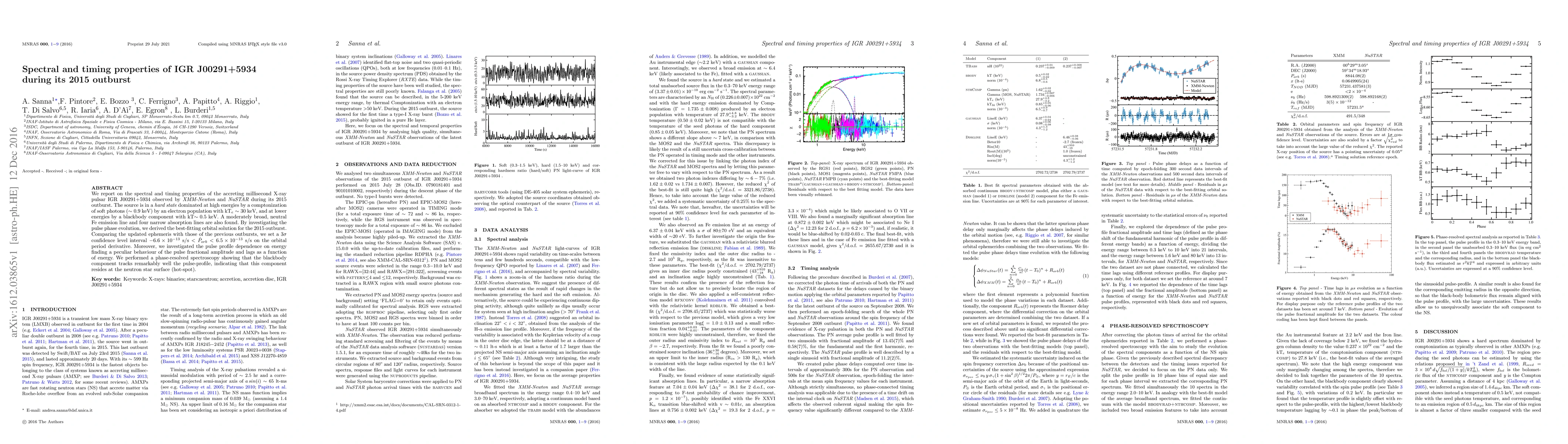 We report on the spectral and timing properties of the accreting millisecond X-ray pulsar IGR J00291+5934 observed by XMM-Newton and NuSTAR during its 2015 outburst. The source is in a hard state dominated at high energies by a comptonization of soft photons ($\sim0.9$ keV) by an electron population with kT$_e\sim30$ keV, and at lower energies by a blackbody component with kT$\sim0.5$ keV. A moderately broad, neutral Fe emission line and four narrow absorption lines are also found. By investigating the pulse phase evolution, we derived the best-fitting orbital solution for the 2015 outburst. Comparing the updated ephemeris with those of the previous outbursts, we set a $3\sigma$ confidence level interval $-6.6\times 10^{-13}$ s/s $< \dot{P}_{orb} < 6.5 \times 10^{-13}$ s/s on the orbital period derivative. Moreover, we investigated the pulse profile dependence on energy finding a peculiar behaviour of the pulse fractional amplitude and lags as a function of energy. We performed a phase-resolved spectroscopy showing that the blackbody component tracks remarkably well the pulse-profile, indicating that this component resides at the neutron star surface (hot-spot).