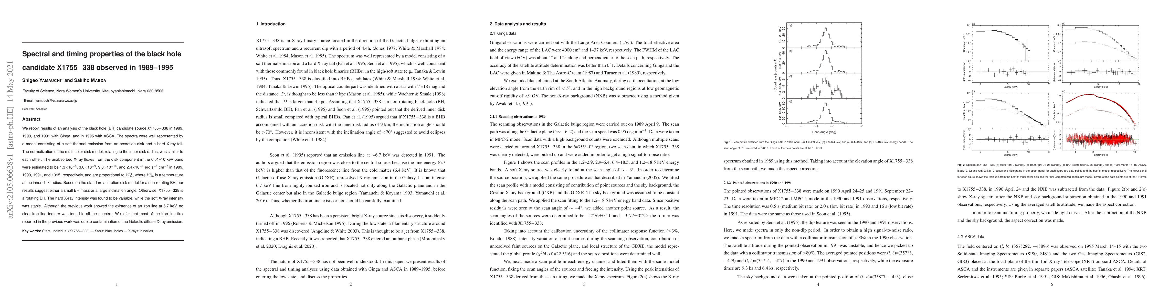 The research analyzed the black hole candidate X1755-338 using data from Ginga (1989-1991) and ASCA (1995) to study its spectral and timing properties.