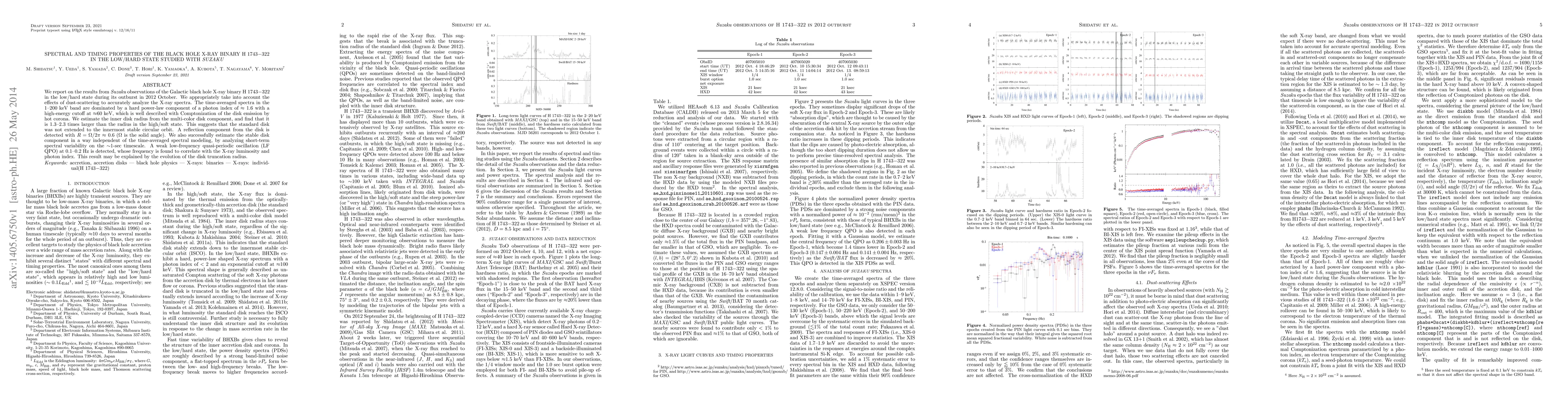 We report on the results from Suzaku observations of the Galactic black hole X-ray binary H 1743-322 in the low/hard state during its outburst in 2012 October. We appropriately take into account the effects of dust-scattering to accurately analyze the X-ray spectra. The time-averaged spectra in the 1-200 keV band are dominated by a hard power-law component of a photon index of \approx 1.6 with a high-energy cutoff at \approx 60 keV, which is well described with Comptonization of the disk emission by hot corona. We estimate the inner disk radius from the multi-color disk component, and find that it is 1.3-2.3 times larger than the radius in the high/soft state. This suggests that the standard disk was not extended to the innermost stable circular orbit. A reflection component from the disk is detected with R = \Omega/2\pi \approx 0.6 (\Omega is the solid angle). We also successfully estimate the stable disk component in a way independent of the time-averaged spectral modeling, by analyzing short-term spectral variability on the \sim 1-sec timescale. A weak low-frequency quasi-periodic oscillation (LF QPO) at 0.1-0.2 Hz is detected, whose frequency is found to correlate with the X-ray luminosity and photon index. This result may be explained by the evolution of the disk truncation radius.