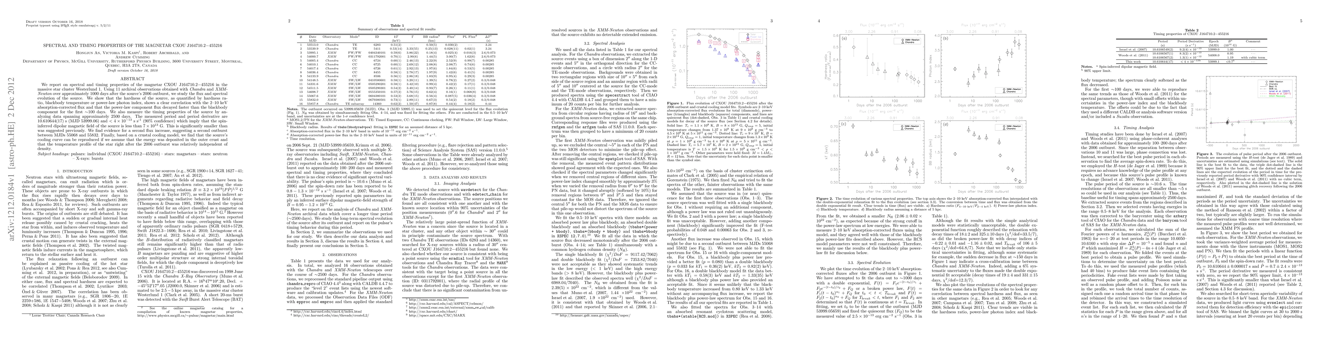 We report on spectral and timing properties of the magnetar CXOU J164710.2-455216 in the massive star cluster Westerlund 1. Using 11 archival observations obtained with Chandra and XMM-Newton over approximately 1000 days after the source's 2006 outburst, we study the flux and spectral evolution of the source. We show that the hardness of the source, as quantified by hardness ratio, blackbody temperature or power-law photon index, shows a clear correlation with the 2--10 keV absorption-corrected flux and that the power-law component flux decayed faster than the blackbody component for the first ~100 days. We also measure the timing properties of the source by analyzing data spanning approximately 2500 days. The measured period and period derivative are 10.610644(17) s (MJD 53999.06) and <4 X 10^{-13} s s^-1 (90% confidence) which imply that the spin-inferred dipolar magnetic field of the source is less than 7 X 10^{13} G. This is significantly smaller than was suggested previously. We find evidence for a second flux increase, suggesting a second outburst between MJDs 55068 and 55832. Finally, based on a crustal cooling model, we find that the source's cooling curve can be reproduced if we assume that the energy was deposited in the outer crust and that the temperature profile of the star right after the 2006 outburst was relatively independent of density.