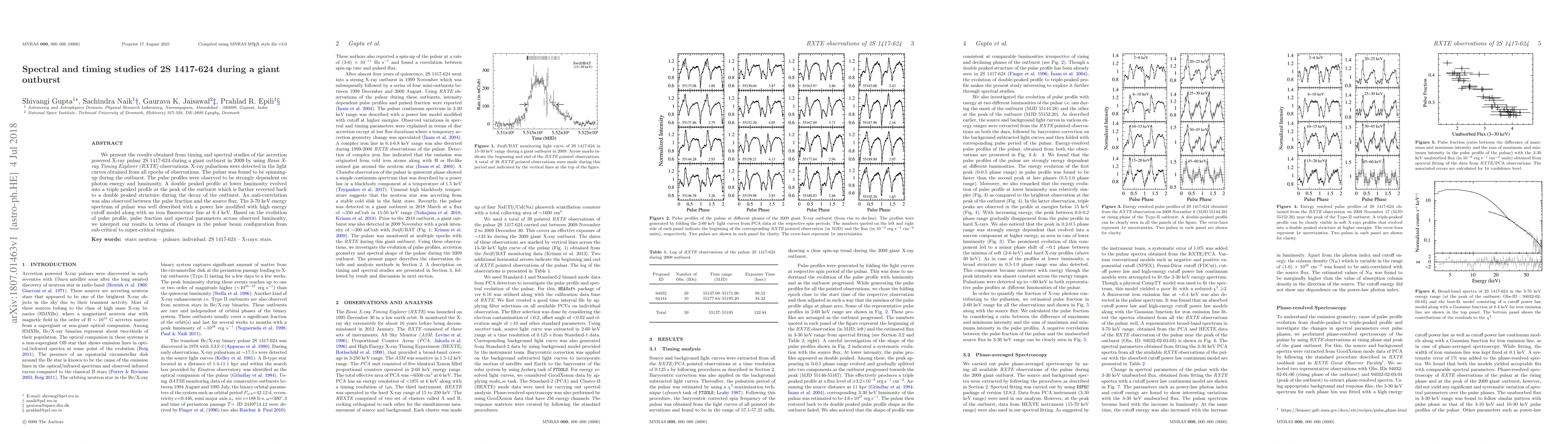 This study investigates the spectral and timing characteristics of the X-ray pulsar 2S 1417-624 during a 2009 giant outburst using RXTE data, revealing a transition from double to triple peaked pulse profiles correlated with luminosity changes, and a spectrum described by a power law with a high-energy cutoff and iron line.