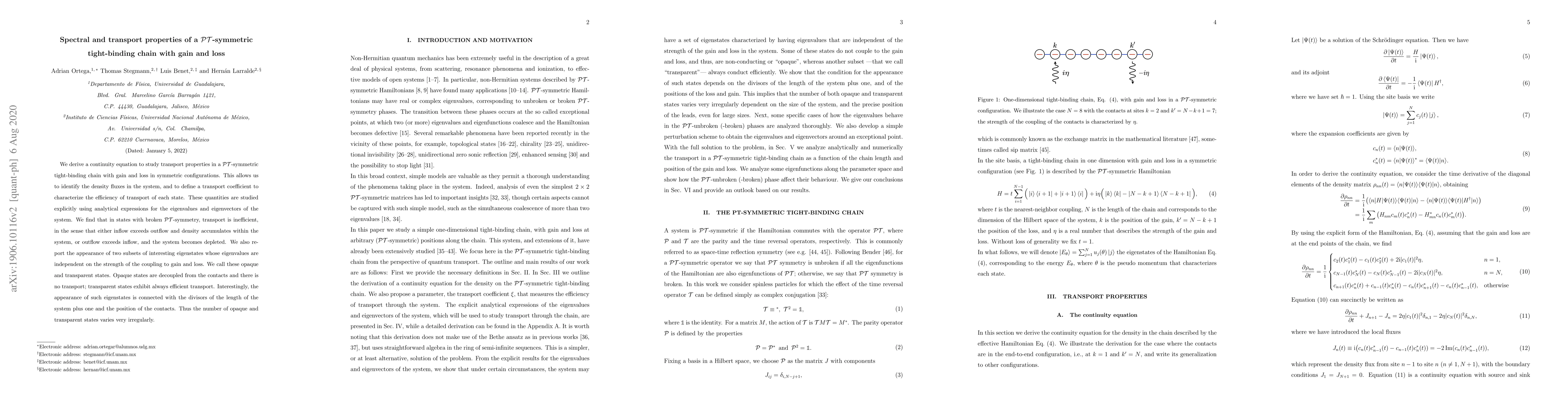We derive a continuity equation to study transport properties in a $\mathcal{PT}$-symmetric tight-binding chain with gain and loss in symmetric configurations. This allows us to identify the density fluxes in the system, and to define a transport coefficient to characterize the efficiency of transport of each state. These quantities are studied explicitly using analytical expressions for the eigenvalues and eigenvectors of the system. We find that in states with broken $\mathcal{PT}$-symmetry, transport is inefficient, in the sense that either inflow exceeds outflow and density accumulates within the system, or outflow exceeds inflow, and the system becomes depleted. We also report the appearance of two subsets of interesting eigenstates whose eigenvalues are independent on the strength of the coupling to gain and loss. We call these opaque and transparent states. Opaque states are decoupled from the contacts and there is no transport; transparent states exhibit always efficient transport. Interestingly, the appearance of such eigenstates is connected with the divisors of the length of the system plus one and the position of the contacts. Thus the number of opaque and transparent states varies very irregularly.