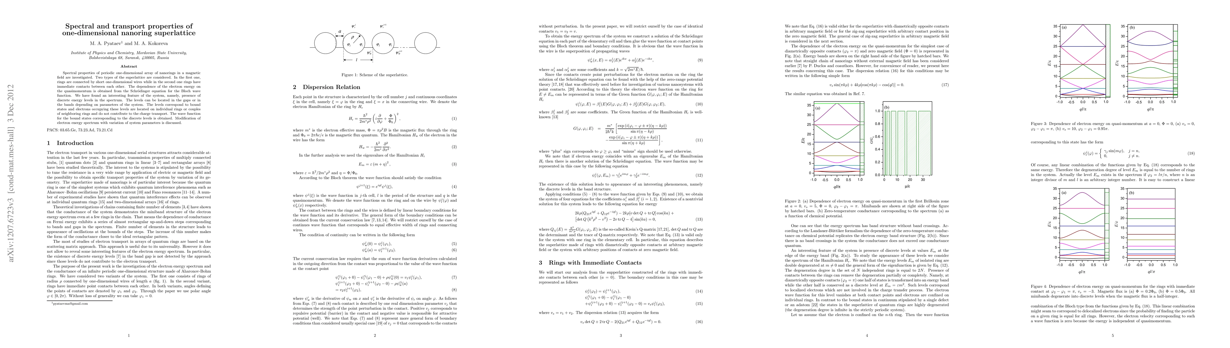 Spectral properties of periodic one-dimensional array of nanorings in a magnetic field are investigated. Two types of the superlattice are considered. In the first one, rings are connected by short one-dimensional wires while in the second one rings have immediate contacts between each other. The dependence of the electron energy on the quasimomentum is obtained from the Schrodinger equation for the Bloch wave function. We have found an interesting feature of the system, namely, presence of discrete energy levels in the spectrum. The levels can be located in the gaps or in the bands depending on parameters of the system. The levels correspond to bound states and electrons occupying these levels are located on individual rings or couples of neighbouring rings and does not contribute to the charge transport. The wave function for the bound states corresponding to the discrete levels is obtained. Modification of electron energy spectrum with variation of system parameters is discussed.