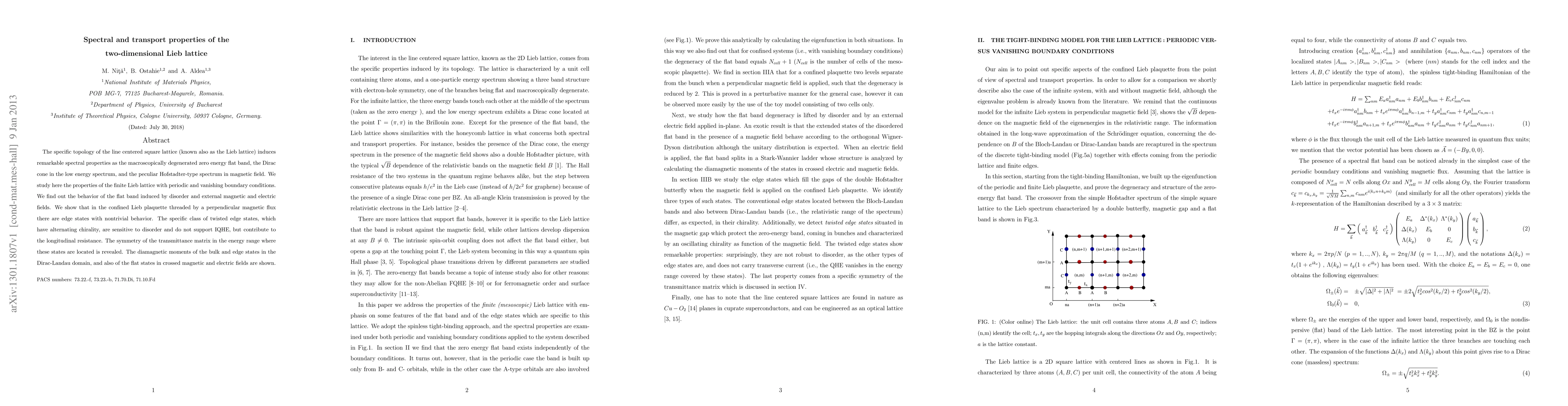 The paper presents a detailed analysis of the spectral and transport properties of the two-dimensional Lieb lattice, including analytical derivations and numerical simulations, revealing unique features like twisted edge states and their response to disorder and electric fields.