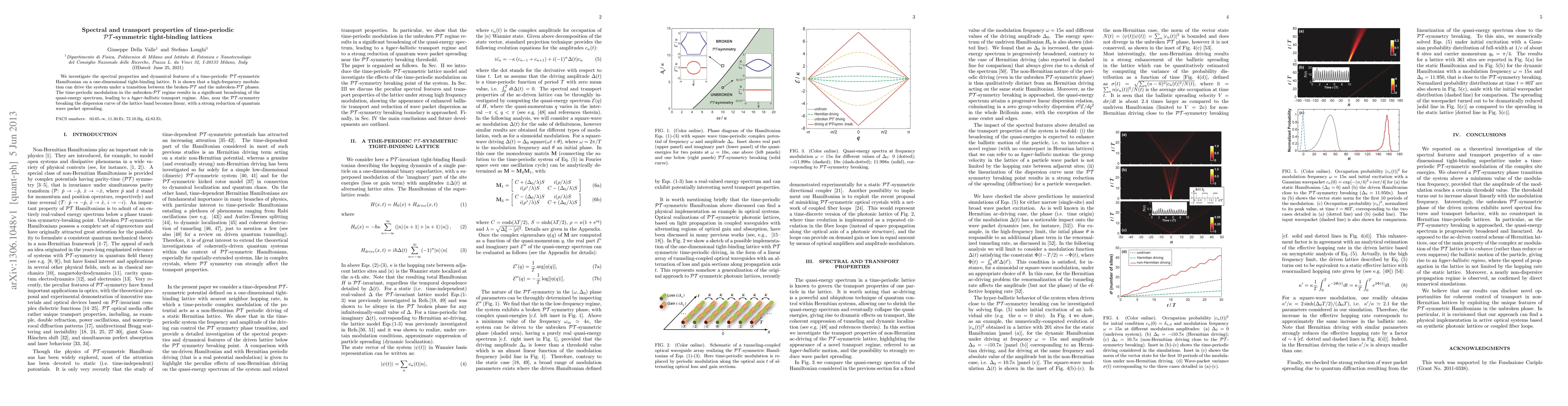 This paper explores the spectral and transport behaviors of a time-periodic PT-symmetric Hamiltonian on a one-dimensional tight-binding lattice, revealing a transition between broken-PT and unbroken-PT phases driven by high-frequency modulation, and demonstrating hyper-ballistic transport in the unbroken-PT regime.