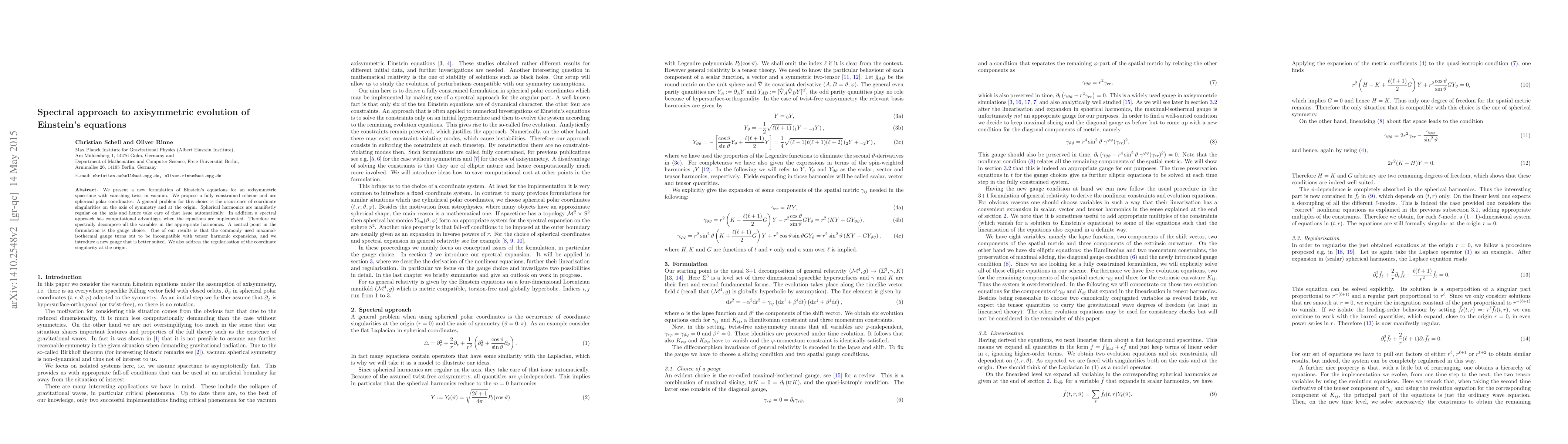This paper introduces a new spectral formulation for solving Einstein's equations in axisymmetric vacuum spacetimes, employing spherical polar coordinates and spherical harmonics to handle coordinate singularities. It proposes a new gauge that is more compatible with tensor harmonic expansions than the maximal-isothermal gauge.