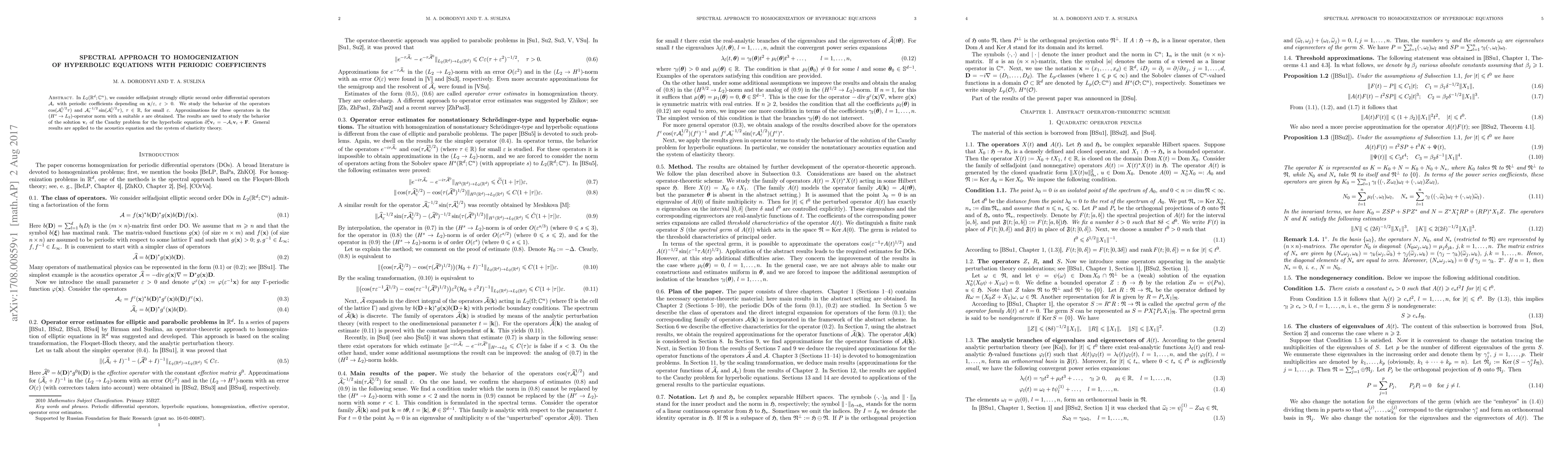 This paper investigates the spectral behavior of hyperbolic equations with periodic coefficients using a spectral approach. It provides approximations for specific operators and applies them to study the solution of the Cauchy problem for hyperbolic equations, with applications to acoustics and elasticity.
