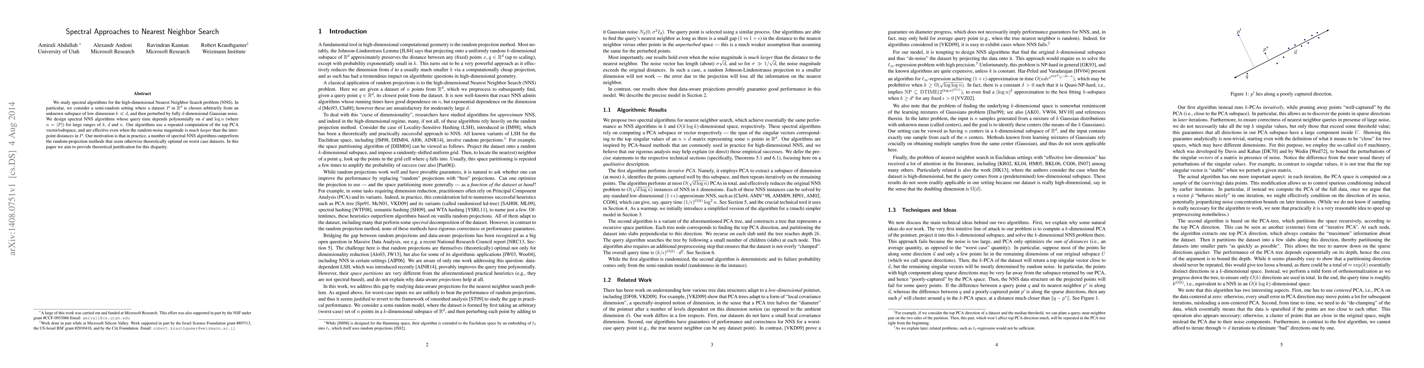 We study spectral algorithms for the high-dimensional Nearest Neighbor Search problem (NNS). In particular, we consider a semi-random setting where a dataset $P$ in $\mathbb{R}^d$ is chosen arbitrarily from an unknown subspace of low dimension $k\ll d$, and then perturbed by fully $d$-dimensional Gaussian noise. We design spectral NNS algorithms whose query time depends polynomially on $d$ and $\log n$ (where $n=|P|$) for large ranges of $k$, $d$ and $n$. Our algorithms use a repeated computation of the top PCA vector/subspace, and are effective even when the random-noise magnitude is {\em much larger} than the interpoint distances in $P$. Our motivation is that in practice, a number of spectral NNS algorithms outperform the random-projection methods that seem otherwise theoretically optimal on worst case datasets. In this paper we aim to provide theoretical justification for this disparity.