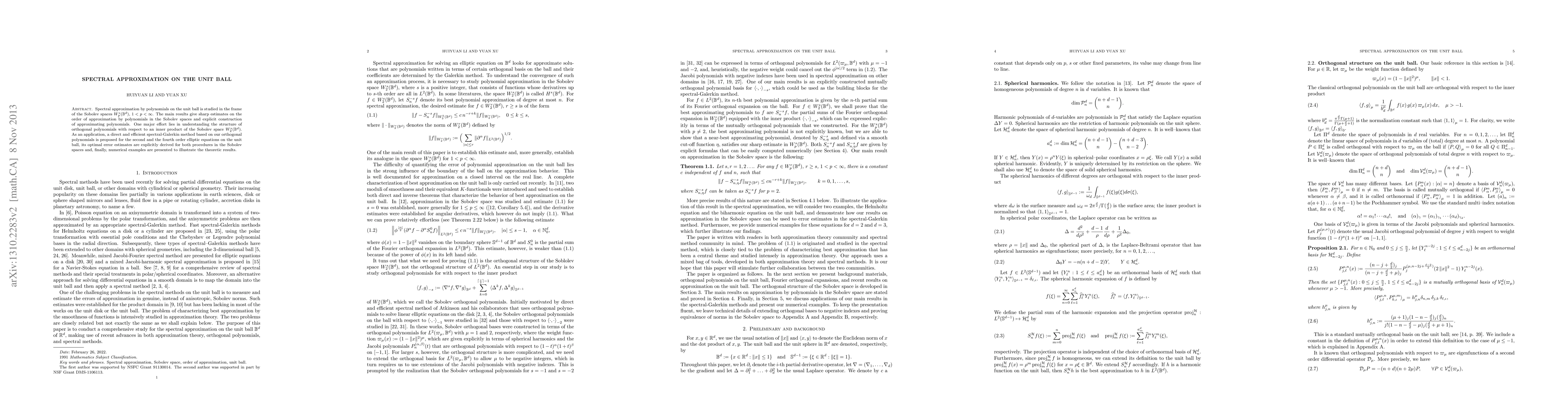 This paper studies spectral approximation by polynomials within Sobolev spaces on the unit ball, providing sharp estimates and explicit constructions for these approximations. It proposes an efficient spectral-Galerkin method for solving elliptic equations, backed by optimal error estimates and numerical examples.