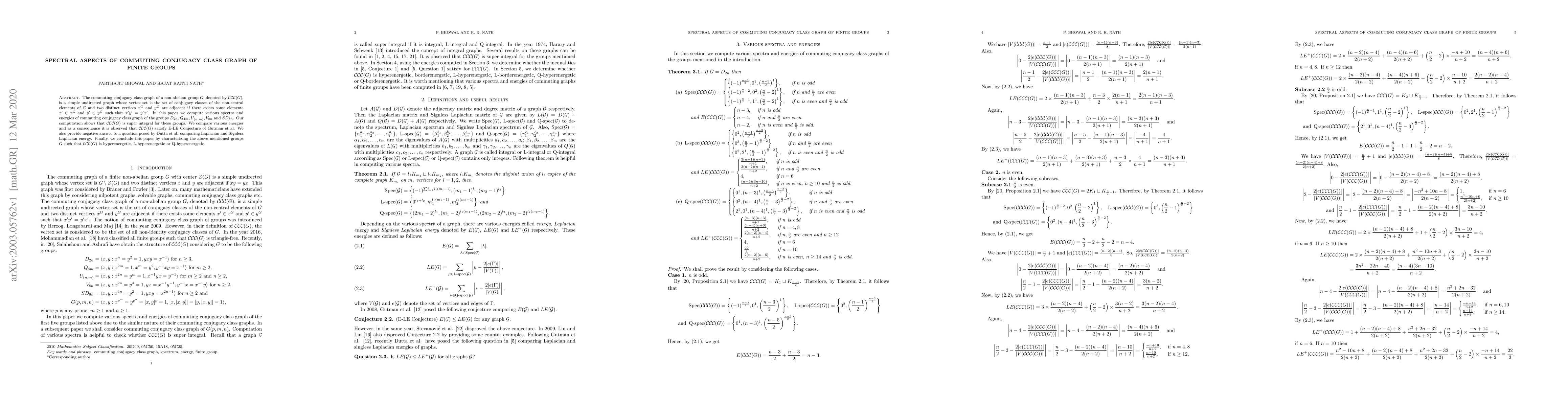 This paper computes spectra and energies of the commuting conjugacy class graph $\mathcal{CCC}(G)$ for specific non-abelian groups, showing $\mathcal{CCC}(G)$ is super integral and satisfies the E-LE Conjecture. It also provides a negative answer to a conjecture regarding Laplacian and Signless Laplacian energy comparison.