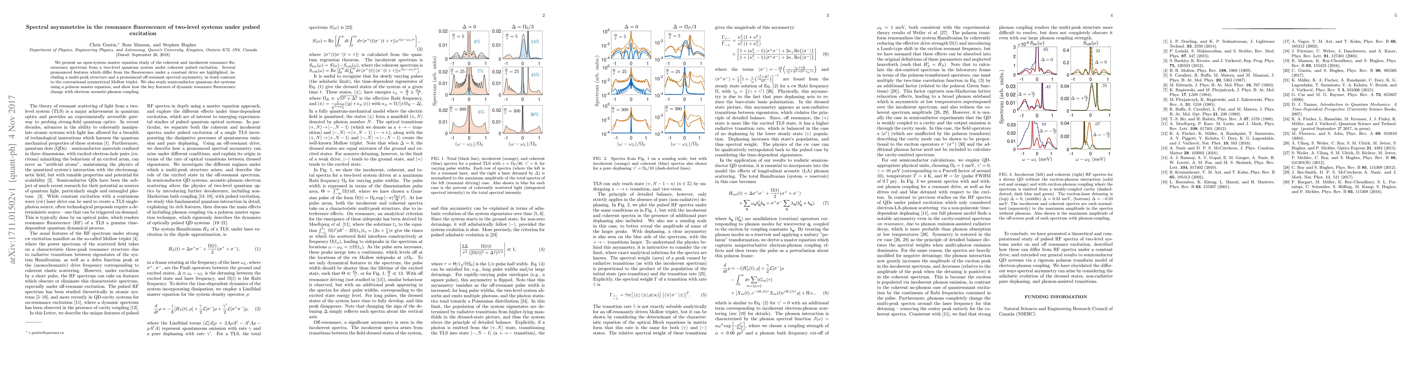 This study investigates the spectral asymmetries in the resonance fluorescence of two-level quantum systems under pulsed excitation, revealing multi-peak structures and pronounced off-resonant asymmetries, contrasting with the symmetrical Mollow triplet under constant drive. Semiconductor quantum dot systems are also analyzed, showing how electron-acoustic-phonon coupling influences dynamic resonance fluorescence.