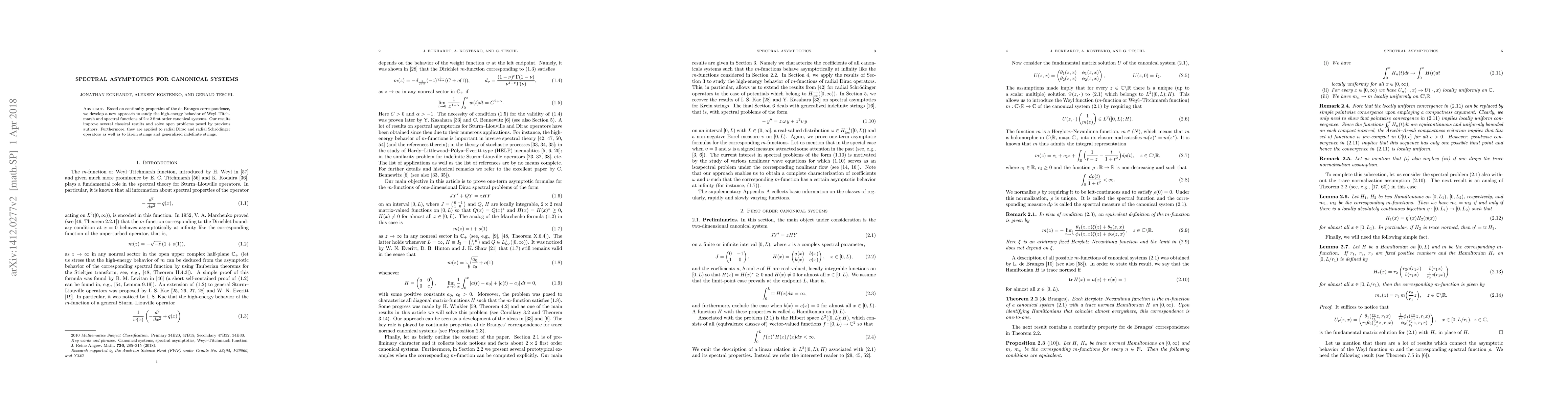 Based on continuity properties of the de Branges correspondence, we develop a new approach to study the high-energy behavior of Weyl-Titchmarsh and spectral functions of $2\times2$ first order canonical systems. Our results improve several classical results and solve open problems posed by previous authors. Furthermore, they are applied to radial Dirac and radial Schr\"odinger operators as well as to Krein strings and generalized indefinite strings.