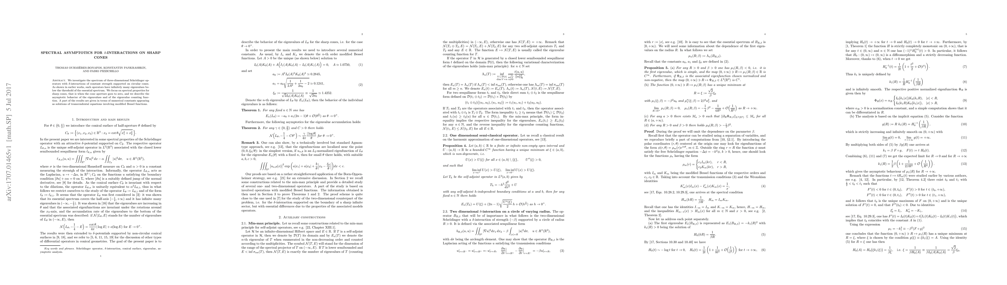 This paper investigates the spectral properties of 3D Schr"{o}dinger operators with θ-interactions on sharp cones, revealing asymptotic behavior of eigenvalues and counting functions in terms of transcendental equations involving modified Bessel functions.
