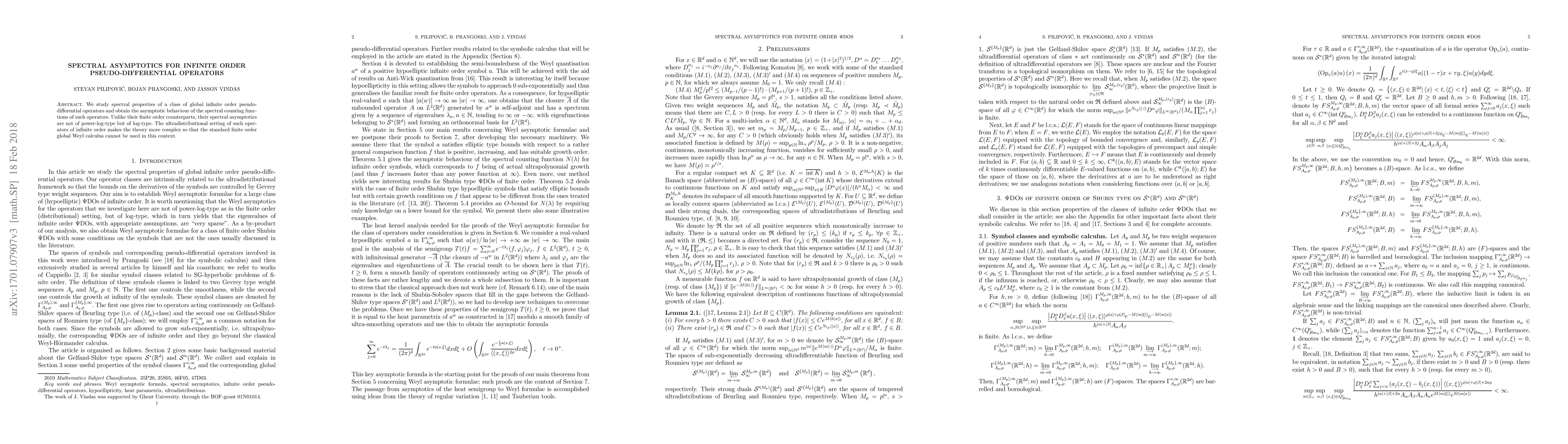 This paper investigates the spectral properties of infinite order pseudo-differential operators, revealing that their spectral counting functions exhibit log-type asymptotic behavior rather than the power-log-type seen in finite order operators. The complexity of the ultradistributional setting necessitates a departure from the standard finite order global Weyl calculus.