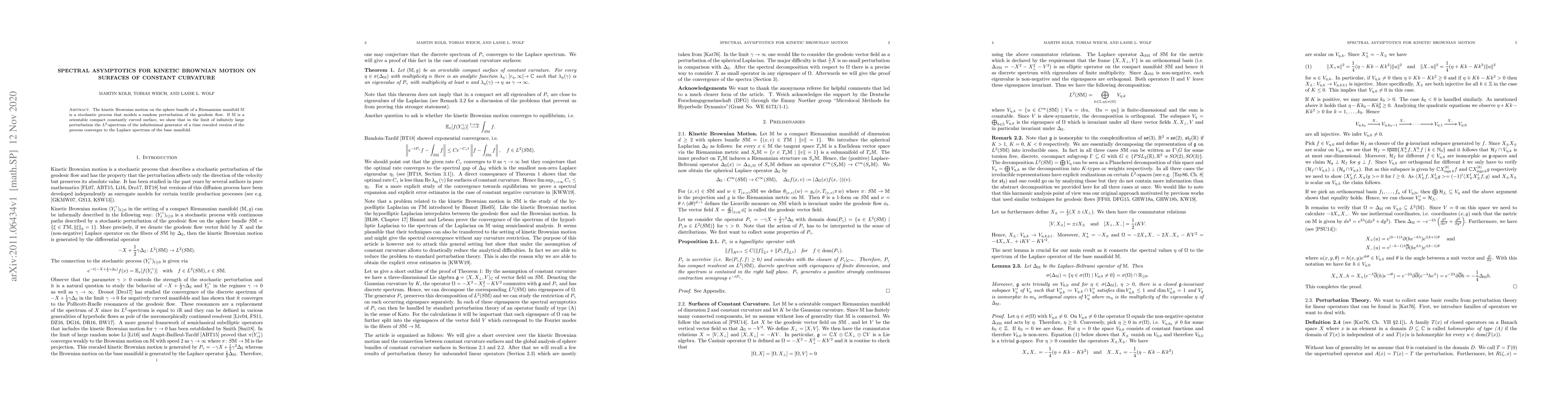 This paper investigates kinetic Brownian motion on orientable compact surfaces of constant curvature, demonstrating that the $L^2$-spectrum of its infinitesimal generator converges to the Laplace spectrum of the base manifold under large perturbation limits.