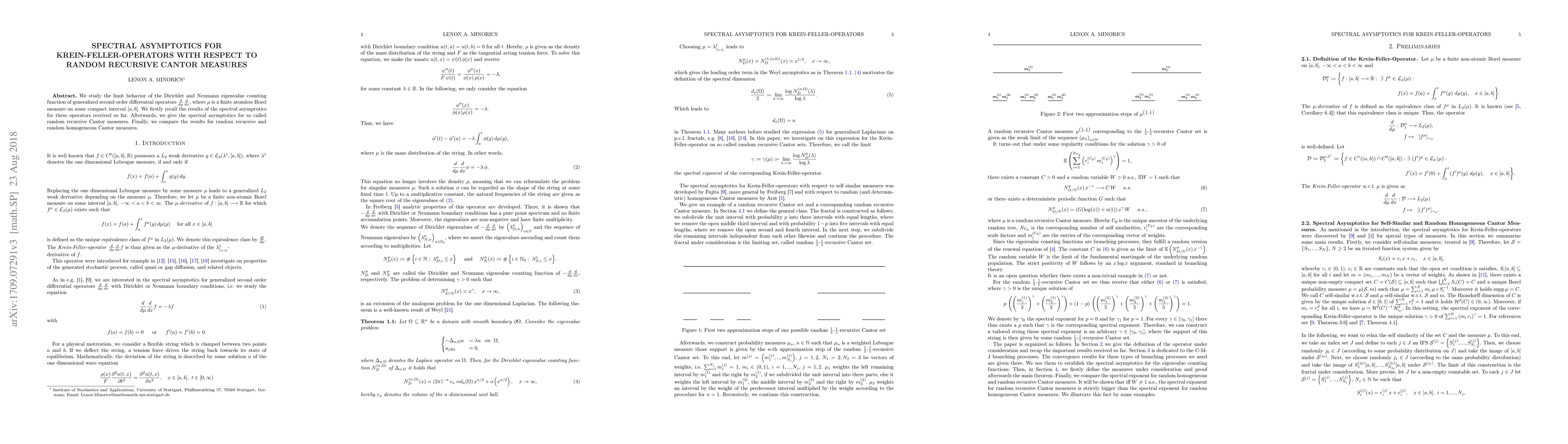 We study the limit behavior of the Dirichlet and Neumann eigenvalue counting function of generalized second order differential operators $\frac{d}{d \mu} \frac{d}{d x}$, where $\mu$ is a finite atomless Borel measure on some compact interval $[a,b]$. We firstly recall the results of the spectral asymptotics for these operators received so far. Afterwards, we give the spectral asymptotics for so called random recursive Cantor measures. Finally, we compare the results for random recursive and random homogeneous Cantor measures.