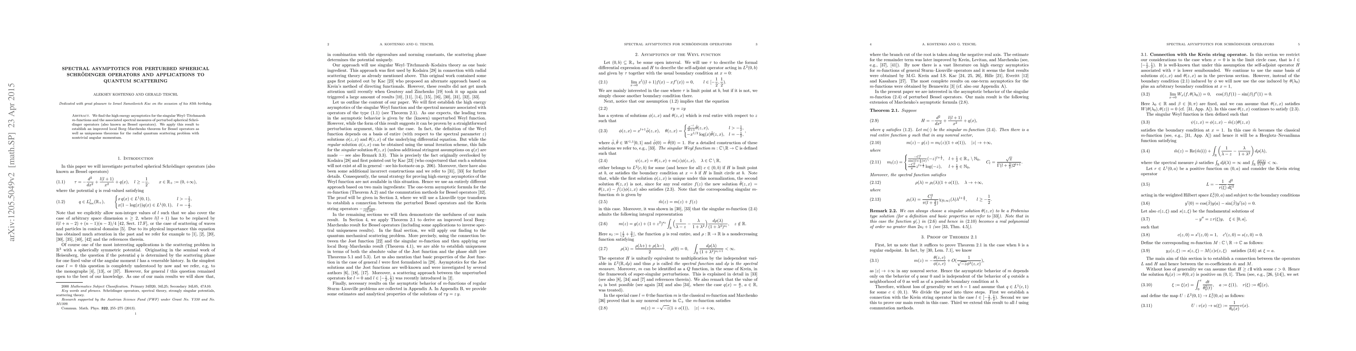 We find the high energy asymptotics for the singular Weyl--Titchmarsh m-functions and the associated spectral measures of perturbed spherical Schr\"odinger operators (also known as Bessel operators). We apply this result to establish an improved local Borg-Marchenko theorem for Bessel operators as well as uniqueness theorems for the radial quantum scattering problem with nontrivial angular momentum.
