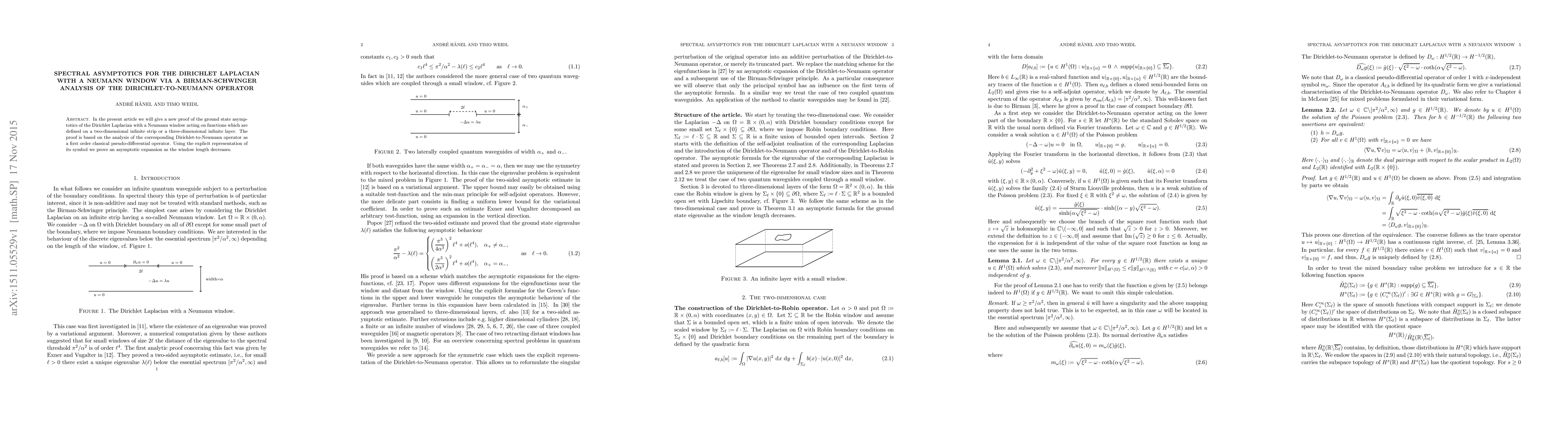 In the present article we will give a new proof of the ground state asymptotics of the Dirichlet Laplacian with a Neumann window acting on functions which are defined on a two-dimensional infinite strip or a three-dimensional infinite layer. The proof is based on the analysis of the corresponding Dirichlet-to-Neumann operator as a first order classical pseudo-differential operator. Using the explicit representation of its symbol we prove an asymptotic expansion as the window length decreases.