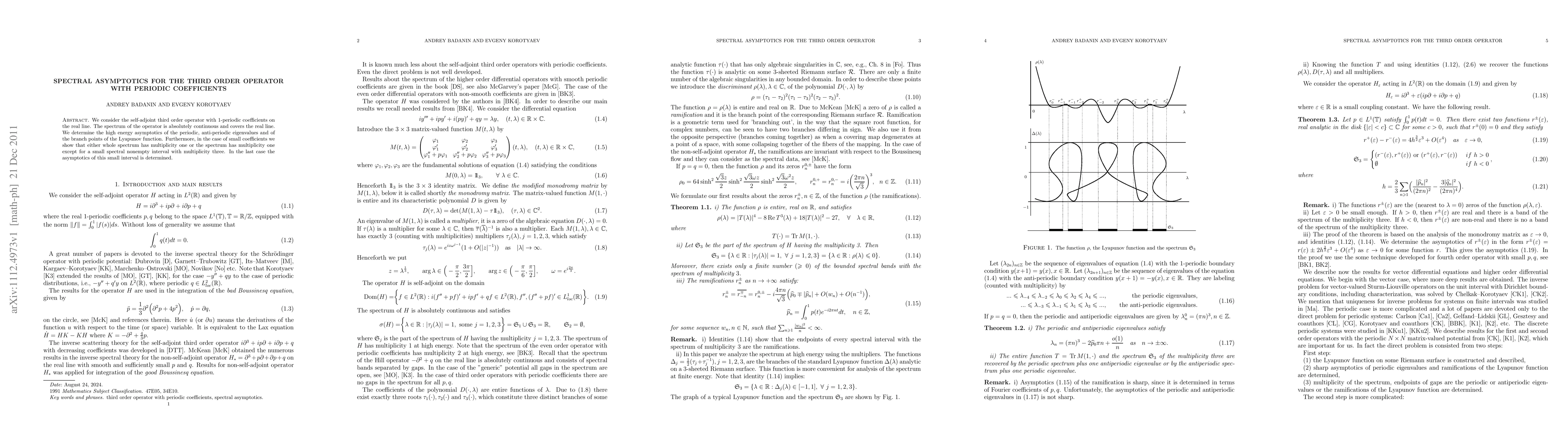 This paper investigates the spectral asymptotics of a self-adjoint third-order differential operator with periodic coefficients. It determines the high energy asymptotics of eigenvalues and branch points of the Lyapunov function, and explores the multiplicity of the spectrum, revealing a small interval with triple multiplicity in certain cases.