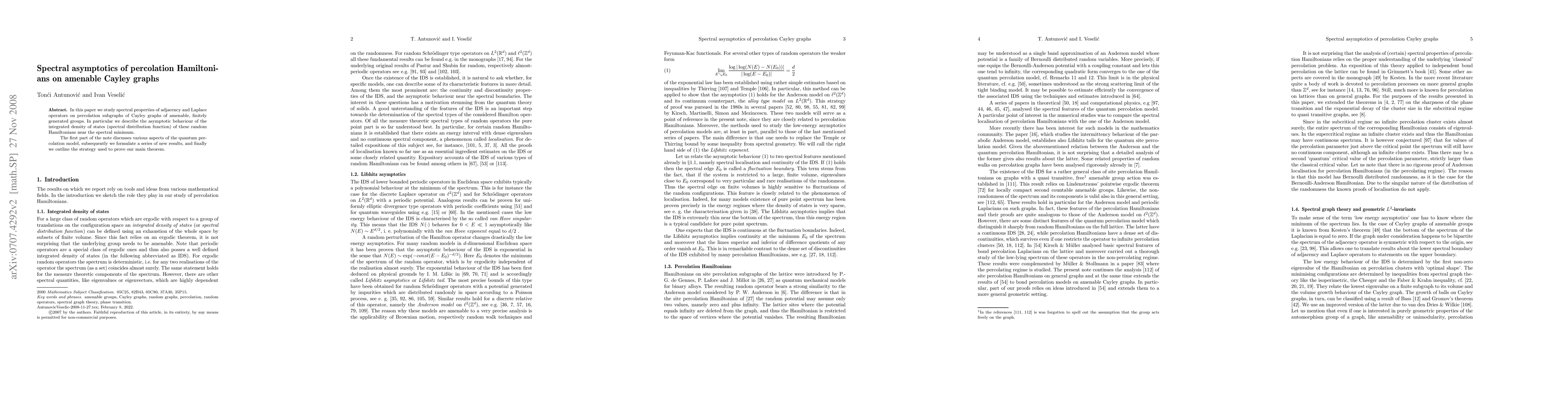 This paper investigates the spectral properties of adjacency and Laplace operators on percolation subgraphs of amenable Cayley graphs, focusing on the asymptotic behavior of the integrated density of states near the spectral minimum. The study concludes with a strategy for proving the main theorem.