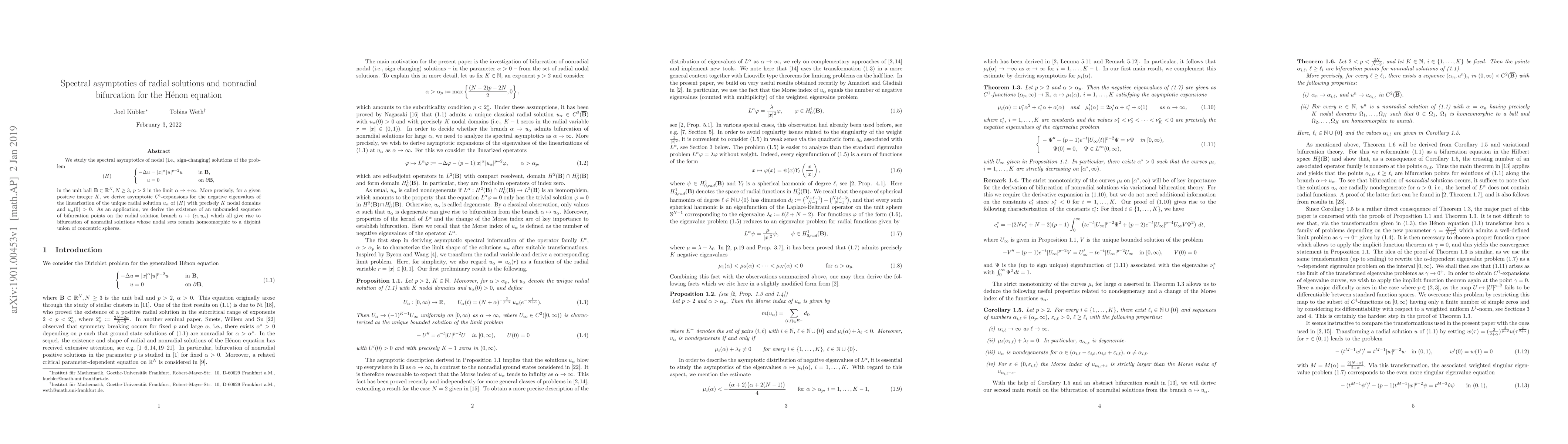 We study the spectral asymptotics of nodal (i.e., sign-changing) solutions of the problem \begin{equation*} (H) \qquad \qquad \left \{ \begin{aligned} -\Delta u &=|x|^\alpha |u|^{p-2}u&&\qquad \text{in ${\bf B}$,} \\ u&=0&&\qquad \text{on $\partial {\bf B}$,} \end{aligned} \right. \end{equation*} in the unit ball ${\bf B} \subset \mathbb{R}^N,N\geq 3$, $p>2$ in the limit $\alpha \to +\infty$. More precisely, for a given positive integer $K$, we derive asymptotic $C^1$-expansions for the negative eigenvalues of the linearization of the unique radial solution $u_\alpha$ of $(H)$ with precisely $K$ nodal domains and $u_\alpha(0)>0$. As an application, we derive the existence of an unbounded sequence of bifurcation points on the radial solution branch $\alpha \mapsto (\alpha,u_\alpha)$ which all give rise to bifurcation of nonradial solutions whose nodal sets remain homeomorphic to a disjoint union of concentric spheres.