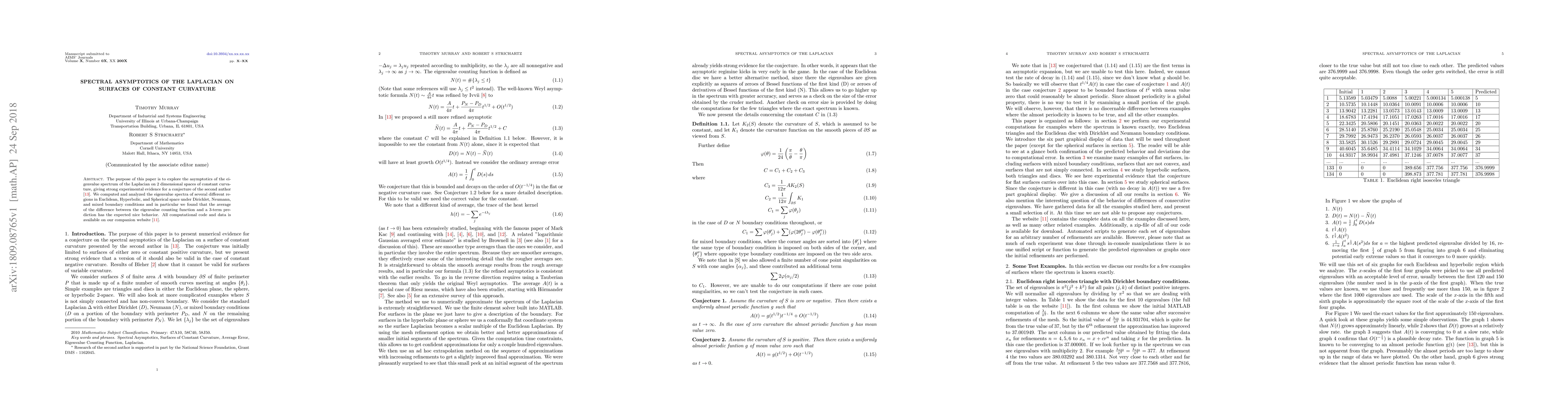 This paper investigates the asymptotic behavior of the Laplacian's eigenvalue spectrum on two-dimensional surfaces of constant curvature, supporting a conjecture through extensive computational analysis under various boundary conditions. All results and code are publicly accessible for verification.