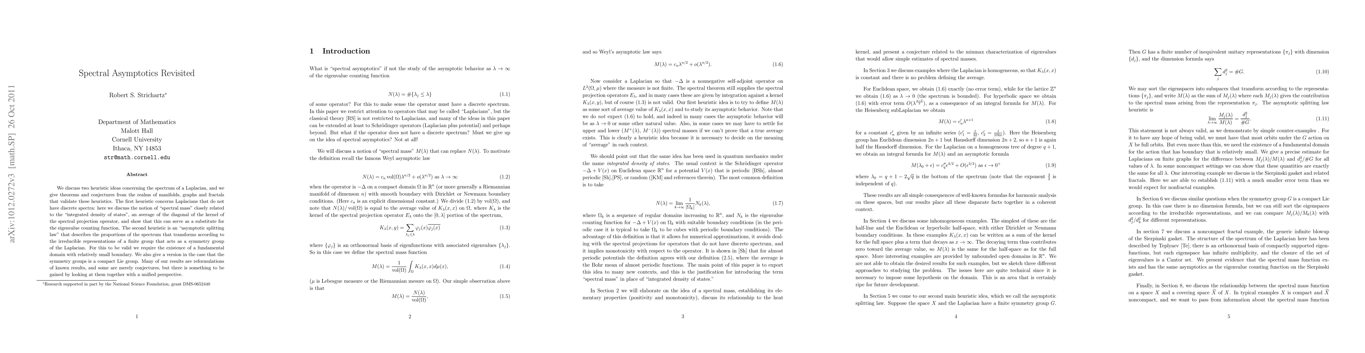 We introduce two new heuristic ideas concerning the spectrum of a Laplacian, and we give theorems and conjectures from the realms of manifolds, graphs and fractals that validate these heuristics. The first heuristic concerns Laplacians that do not have discrete spectra: here we introduce a notion of "spectral mass", an average of the diagonal of the kernel of the spectral projection operator, and show that this can serve as a substitute for the eigenvalue counting function. The second heuristic is an "asymptotic Schur's lemma" that describes the proportions of the spectrum that transforms according to the irreducible representations of a finite group that acts as a symmetric group of the Laplacian. For this to be valid we require the existence of a fundamental domain with relatively small boundary. We also give a version in the case that the symmetry groups is a compact Lie group. Many of our results are reformulations of known results, and some are merely conjectures, but there is something to be gained by looking at them together with a new perspective.