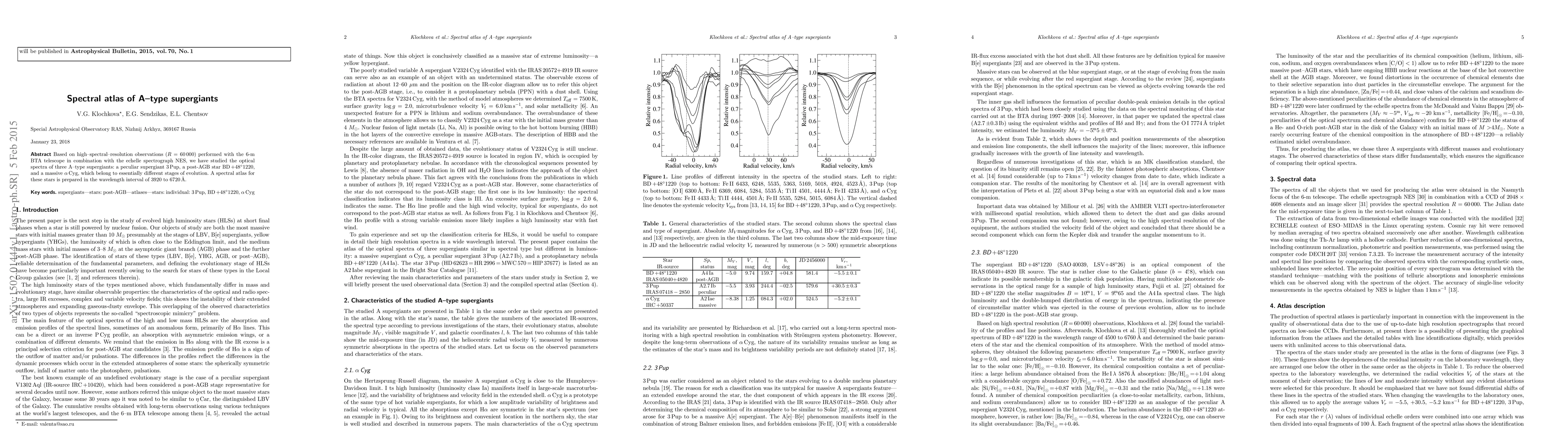 Based on high-spectral-resolution observations (R=60000) performed with the 6-m BTA telescope in combination with the echelle spectrograph NES, we have studied the optical spectra of three A-type supergiants: a peculiar supergiant 3 Pup, a post-AGB star BD+48 1220, and a massive $\alpha$ Cyg, which belong to essentially different stages of evolution. A spectral atlas for these stars is prepared in the wavelength interval of 3920 to 6720 \AA.