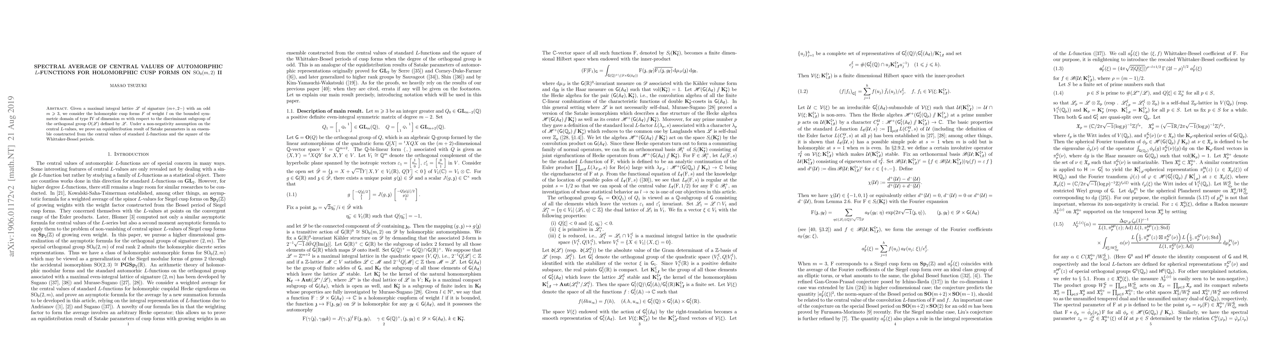 Given a maximal even-integral lattice $\cL$ of signature $(m+, 2-)$ with an odd $m\geq 3$, we consider the holomorphic cusp forms $F$ of weight $l$ on the bounded symmetric domain of type IV of dimension $m$ with respect to the discriminant subgroup of the orthogonal group $O(\cL)$ defined by $\cL$. Under a non-negativity assumption on the central $L$-values, we prove an equidistribution result of Satake parameters in an ensemble constructed from the central values of standard $L$-functions and the square of the Whittaker-Bessel periods.