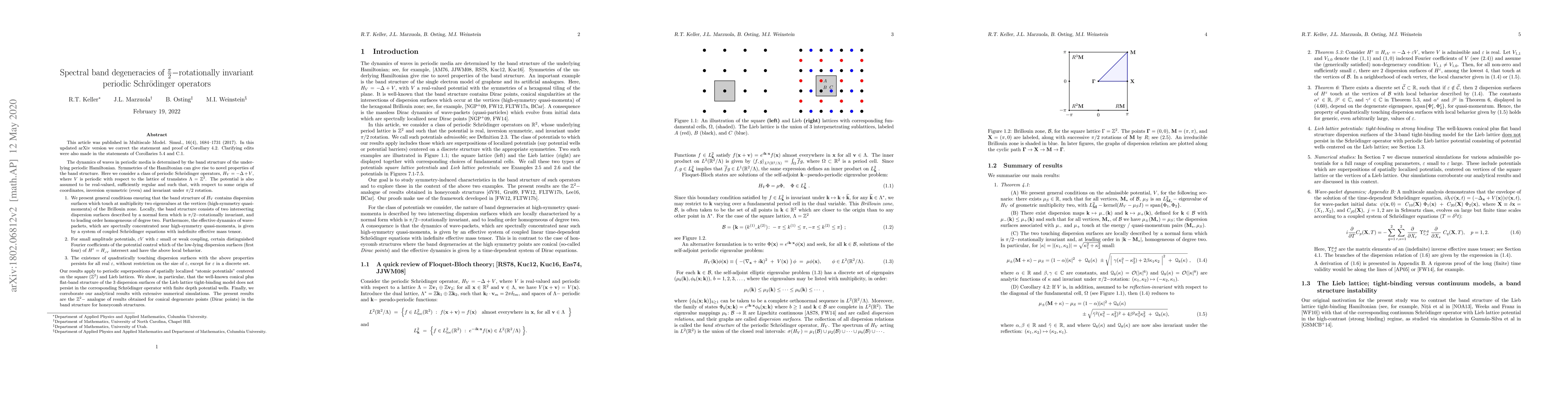 The dynamics of waves in periodic media is determined by the band structure of the underlying periodic Hamiltonian. Symmetries of the Hamiltonian can give rise to novel properties of the band structure. Here we consider a class of periodic Schr\"odinger operators, $H_V=-\Delta+V$, where $V$ is periodic with respect to the lattice of translates $\Lambda=\mathbb{Z}^2$. The potential is also assumed to be real-valued, sufficiently regular and such that, with respect to some origin of coordinates, inversion symmetric (even) and invariant under $\pi/2$ rotation. The present results are the $\mathbb{Z}^2-$ analogue of results obtained for conical degenerate points (Dirac points) in honeycomb structures. Our proofs make use of the framework developed by Fefferman-Weinstein and Fefferman-Lee-Thorp-Weinstein.