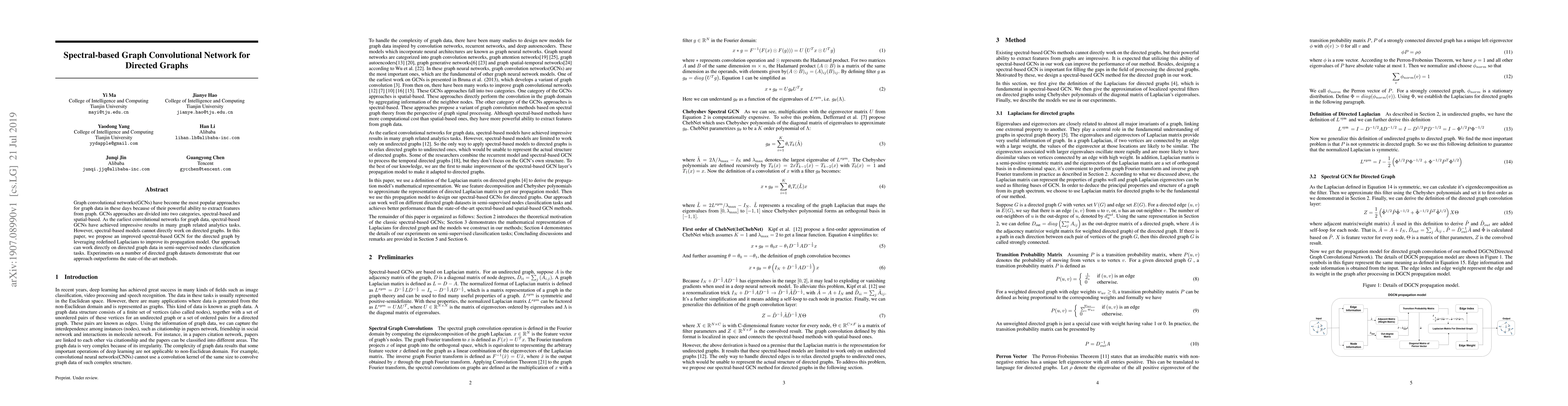 Graph convolutional networks(GCNs) have become the most popular approaches for graph data in these days because of their powerful ability to extract features from graph. GCNs approaches are divided into two categories, spectral-based and spatial-based. As the earliest convolutional networks for graph data, spectral-based GCNs have achieved impressive results in many graph related analytics tasks. However, spectral-based models cannot directly work on directed graphs. In this paper, we propose an improved spectral-based GCN for the directed graph by leveraging redefined Laplacians to improve its propagation model. Our approach can work directly on directed graph data in semi-supervised nodes classification tasks. Experiments on a number of directed graph datasets demonstrate that our approach outperforms the state-of-the-art methods.
