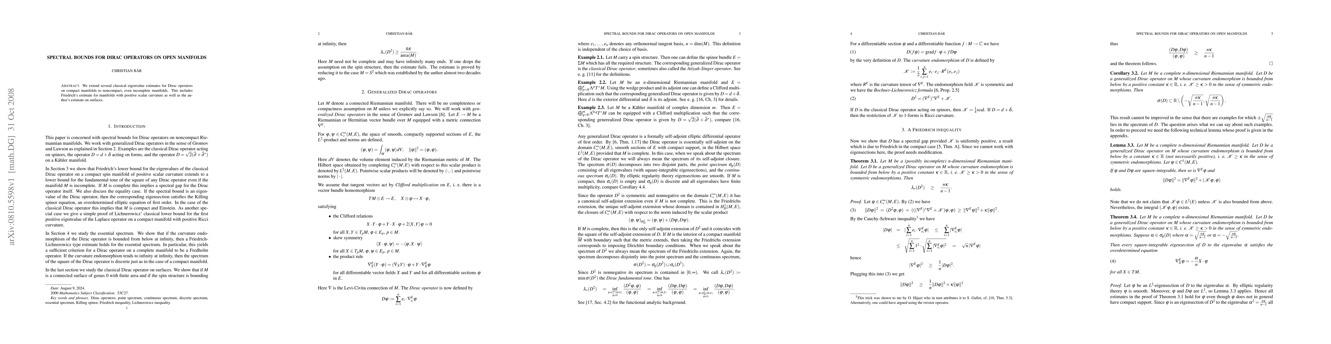 This paper extends classical eigenvalue estimates for Dirac operators from compact to noncompact, potentially incomplete manifolds, including Friedrich's estimate for positively curved manifolds and the author's estimate for surfaces. The results provide new insights into the spectral properties of Dirac operators in less regular settings.