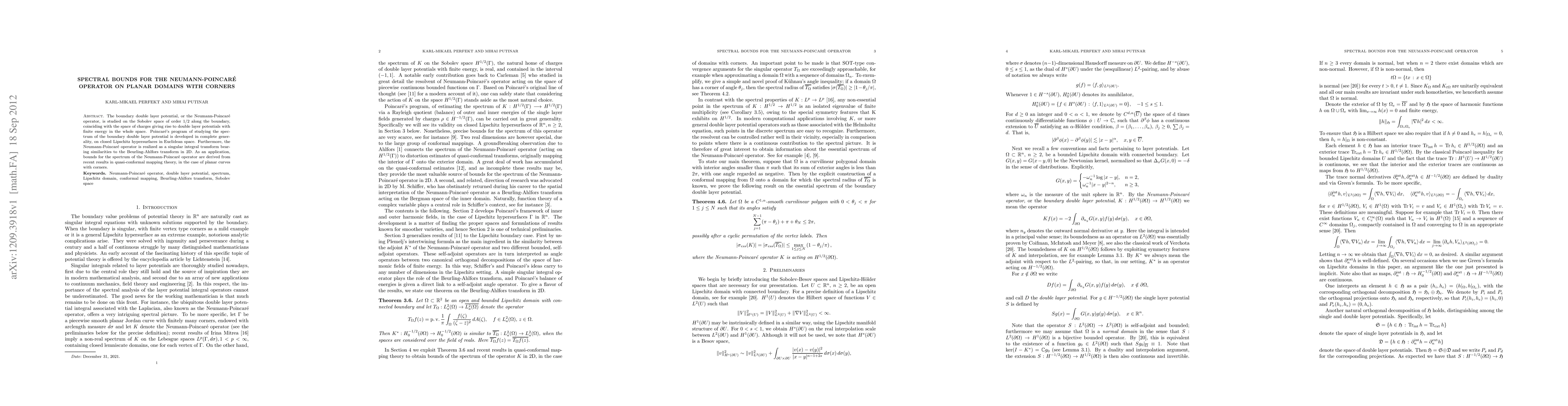 This paper studies the Neumann-Poincaré operator on the boundary of planar domains with corners, realizing it as a singular integral transform. It derives spectral bounds for the operator using quasi-conformal mapping theory, extending Poincaré's program to closed Lipschitz hypersurfaces.