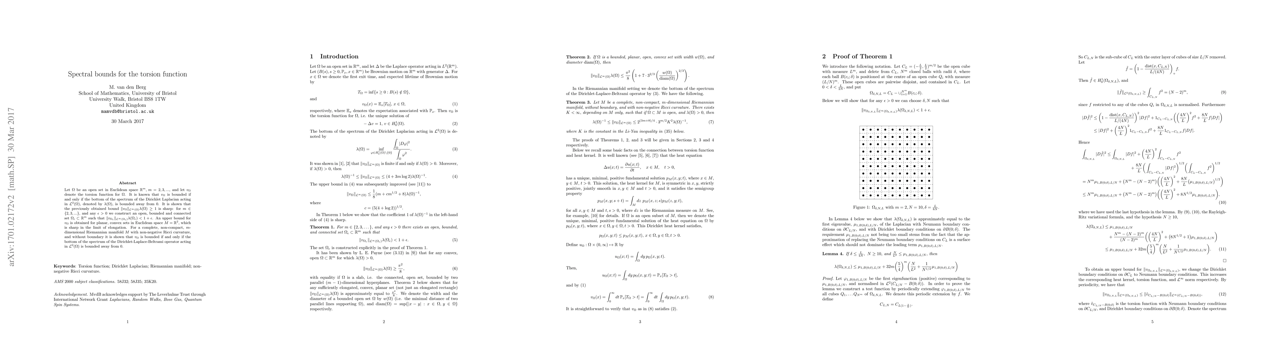 Let $\Omega$ be an open set in Euclidean space $\R^m,\, m=2,3,...$, and let $v_{\Omega}$ denote the torsion function for $\Omega$. It is known that $v_{\Omega}$ is bounded if and only if the bottom of the spectrum of the Dirichlet Laplacian acting in $\Leb^2(\Omega)$, denoted by $\lambda(\Omega)$, is bounded away from $0$. It is shown that the previously obtained bound $\|v_{\Omega}\|_{\Leb^{\infty}(\Omega)}\lambda(\Omega)\ge 1$ is sharp: for $m\in\{2,3,...\}$, and any $\epsilon>0$ we construct an open, bounded and connected set $\Omega_{\epsilon}\subset \R^m$ such that $\|v_{\Omega_{\epsilon}}\|_{\Leb^{\infty}(\Omega_{\epsilon})} \lambda(\Omega_{\epsilon})<1+\epsilon$. An upper bound for $v_{\Omega}$ is obtained for planar, convex sets in Euclidean space $M=\R^2$, which is sharp in the limit of elongation. For a complete, non-compact, $m$-dimensional Riemannian manifold $M$ with non-negative Ricci curvature, and without boundary it is shown that $v_{\Omega}$ is bounded if and only if the bottom of the spectrum of the Dirichlet-Laplace-Beltrami operator acting in $\Leb^2(\Omega)$ is bounded away from $0$.