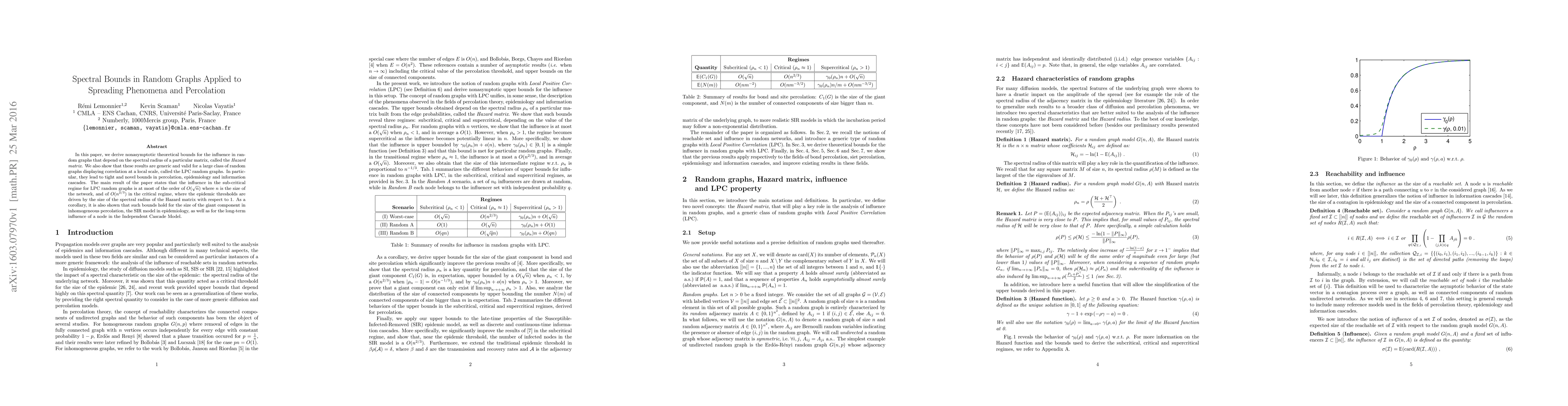 In this paper, we derive nonasymptotic theoretical bounds for the influence in random graphs that depend on the spectral radius of a particular matrix, called the Hazard matrix. We also show that these results are generic and valid for a large class of random graphs displaying correlation at a local scale, called the LPC random graphs. In particular, they lead to tight and novel bounds in percolation, epidemiology and information cascades. The main result of the paper states that the influence in the sub-critical regime for LPC random graphs is at most of the order of $O(\sqrt{n})$ where $n$ is the size of the network, and of $O(n^{2/3})$ in the critical regime, where the epidemic thresholds are driven by the size of the spectral radius of the Hazard matrix with respect to 1. As a corollary, it is also shown that such bounds hold for the size of the giant component in inhomogeneous percolation, the SIR model in epidemiology, as well as for the long-term influence of a node in the Independent Cascade Model.