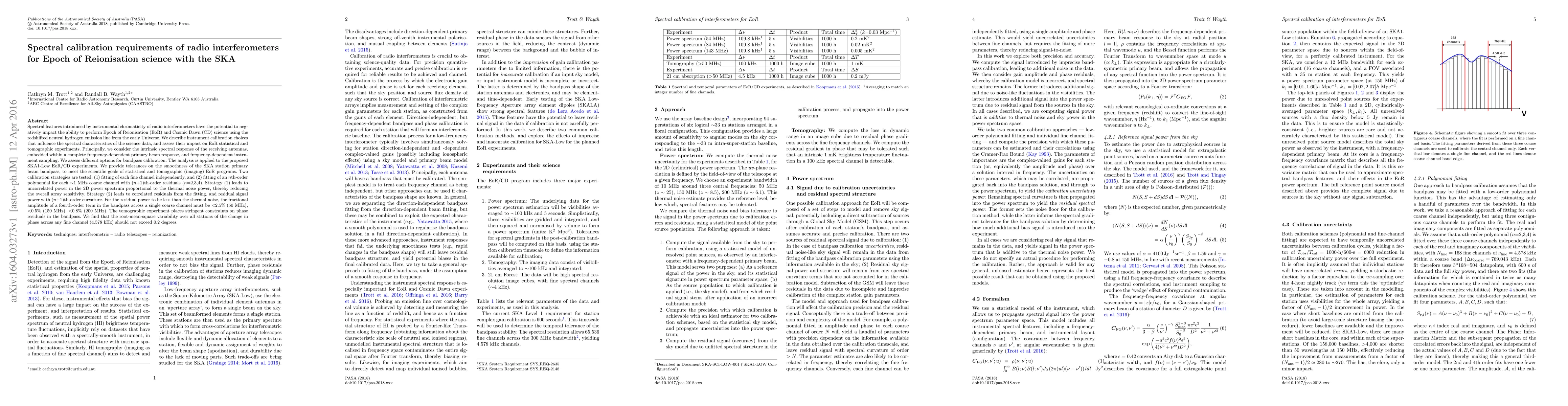 This paper discusses spectral calibration requirements for radio interferometers, particularly the SKA1-Low, to accurately perform Epoch of Reionisation (EoR) science. It evaluates calibration strategies to minimize instrumental chromaticity effects, finding that a fourth-order bandpass term must be <2.5% across a 50 MHz channel to meet scientific goals, with stringent phase residual constraints for tomographic experiments.
