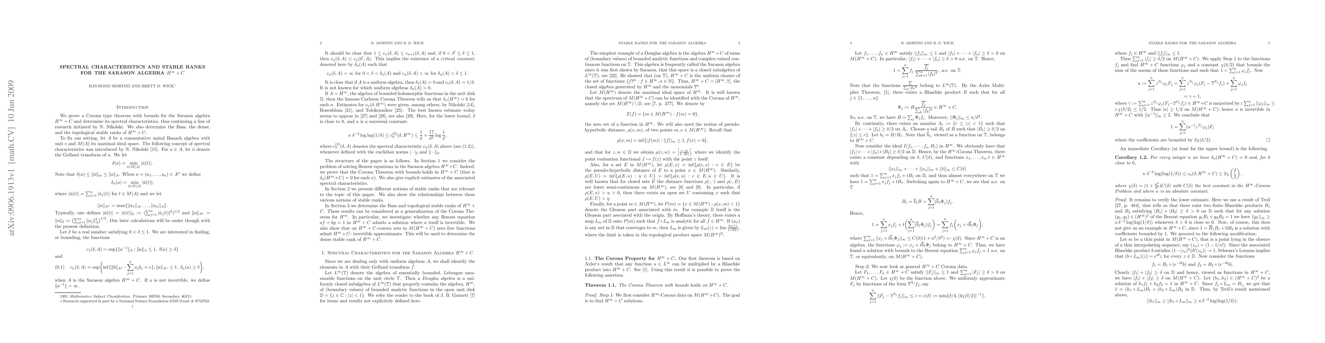 This paper proves a Corona type theorem with bounds for the Sarason algebra $H^\infty+C$ and analyzes its spectral characteristics. Additionally, it determines the Bass, dense, and topological stable ranks of $H^\infty+C$.